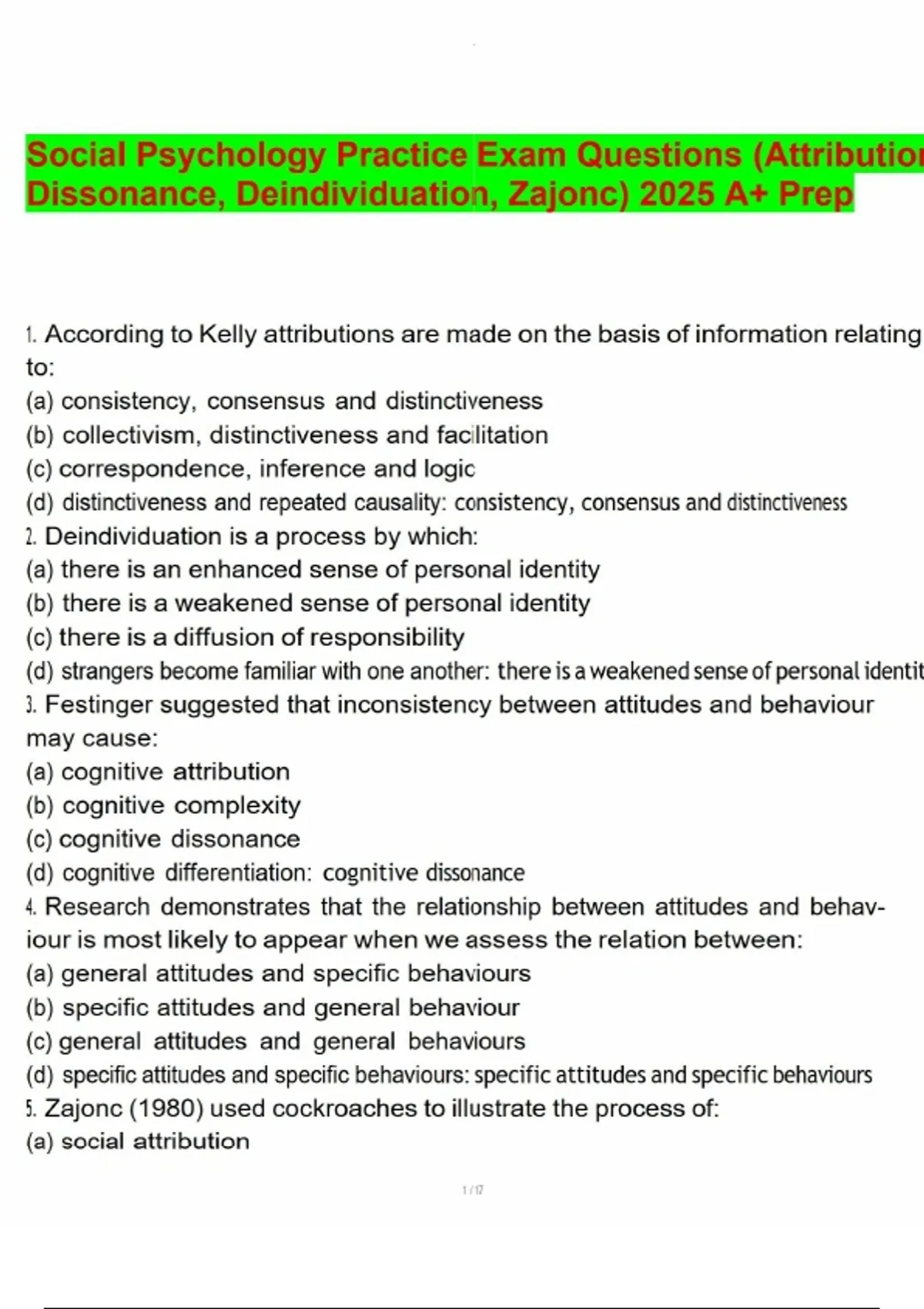Social Psychology Practice Exam Questions (Attribution, Dissonance, Deindividuation, Zajonc) 2025 A+ P Social Psychology Practice Exam Questions (Attribution, Dissonance, Deindividuation, Zajonc) 2025 A+ P Social Psychology Practice Exam Questions (Attribution, Dissonance, Deindividuation, Zajonc) 2025 A+ P Social Psychology Practice Exam Questions (Attribution, Dissonance, Deindividuation, Zajonc) 2025 A+ P