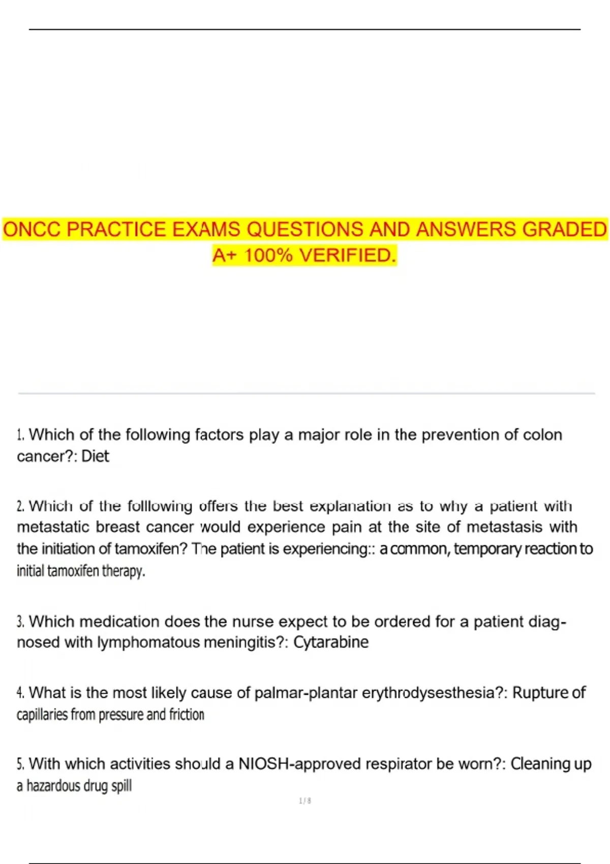 This document offers a complete collection of ONCC practice exam questions and 100% verified answers, graded A+. It covers essential oncology nursing concepts and exam-relevant material, making it a reliable resource for certification preparation. Structured for clarity and accuracy, it helps students review effectively and build confidence for exam success.