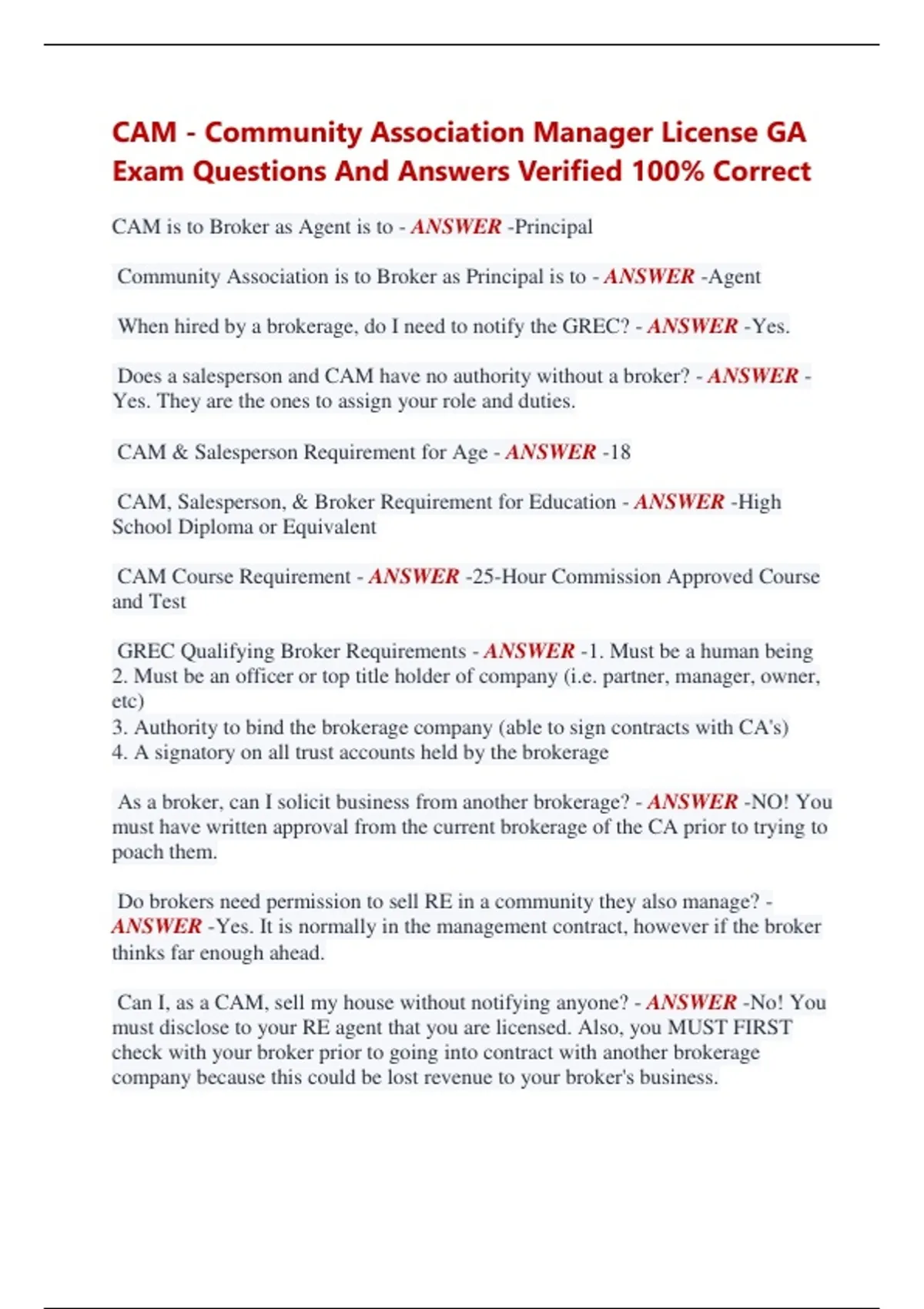 CAM - Community Association Manager License GA Exam Questions And Answers Verified 100% Correct CAM is to Broker as Agent is to - ANSWER -Principal Community Association is to Broker as Principal is to - ANSWER -Agent When hired by a brokerage, do I need to notify the GREC? - ANSWER -Yes. Does a salesperson and CAM have no authority without a broker? - ANSWER Yes. They are the ones to assign your role and duties. CAM & Salesperson Requirement for Age - ANSWER -18 CAM, Salesperson, & Broker Requirement for Education - ANSWER -High School Diploma or Equivalent CAM Course Requirement - ANSWER -25-Hour Commission Approved Course and Test GREC Qualifying Broker Requirements - ANSWER -1. Must be a human being 2. Must be an officer or top title holder of company (i.e. partner, manager, owner, etc) 3. Authority to bind the brokerage company (able to sign contracts with CA's) 4. A signatory on all trust accounts held by the brokerage As a broker, can I solicit business from another brokerage? - ANSWER -NO! You must have written approval from the current brokerage of the CA prior to trying to poach them. Do brokers need permission to sell RE in a community they also manage? - ANSWER -Yes. It is normally in the management contract, however if the broker thinks far enough ahead. Can I, as a CAM, sell my house without notifying anyone? - ANSWER -No! You must disclose to your RE agent that you are licensed. Also, you MUST FIRST check with your broker prior to going into contract with another brokerage company because this could be lost revenue to your broker's business. How long does the broker have to return documents after termination of contract? - ANSWER -30 days. Must return complete and accurate records of all financials, funds, and any documents or records received on the Associations behalf Severability - ANSWER -cancelling the whole or part of a contract Term of a Contract - ANSWER -Length of time it is valid; REQUIRED on ALL contracts When is Fidelity Insurance Required? - ANSWER -Required when a broker has access to more than $60,000 in funds to be covered by a bond (insurance) How much should fidelity insurance cover? - ANSWER -It should cover the maximum amount of funds that the broker has access to, but should never be less than the sum of 3 month assessments due from all members of the association and the reserve funds combined Exclusive management agreement with community associations must contain a: - ANSWER -Term Clause Who determines the duties of a licensed CAM? - ANSWER -The qualifying broker What are the two types of property? - ANSWER -Real and Personal Personal Property - ANSWER -All property which is movable in nature (i.e. furniture, crops, cut timber) Real Property - ANSWER -All things permanently attached to the land or to the buildings (i.e. soil, concrete bed the house is on, house walls) To Sell Personal Property, What type of Document is Needed? - ANSWER -Bill of Sale To Sell Real Property, What type of document is needed? - ANSWER -Deed What is required on a deed to sell real property in GA? - ANSWER -1. Name and signature of grantor 2. Name of grantee 3. Legal description of property 4. Sentence or two explaining the value/consideration being received by the grantor to grantee 5. Sentence explaining what the grantor is conveying/rights given to the grantee (example: allowing them to purchase air rights, tree rights?) Grantor - ANSWER -The seller or Giver of the property Grantee - ANSWER -Receiver of the property How is a deed valid or enforcable? - ANSWER -As soon as it is signed by the grantor! However, for the public to know, one must Record the deed in the county land records with the following: 1. One unofficial witness 2. One Official witness (usually a notary public) 3. Attestation of witnesses that it was signed in their presence 4. name and address of the grantee for the official document to be returned to once documented What are the three types of Legal Descriptions? - ANSWER -1. Short Form Legal 2. Long Form Legal 3. Condominium Legal Short Form Legal Description Requirements - ANSWER -State and county where property is located Land lot, district and section Subdivision/project name Lot numbner and Block Plat book and page number where the plat is recorded in the county land records Long Form Legal Description Requirements - ANSWER -Known as Metes and Bounds (aka, a set point of earth as described and the perimeter which includes degrees, minutes, seconds, and compass bearings) Condominium Legal Description Requirements - ANSWER -Condominium unit number Name and recording information for the Declaration of Condominium Reference to recording info for the plat and floor plans