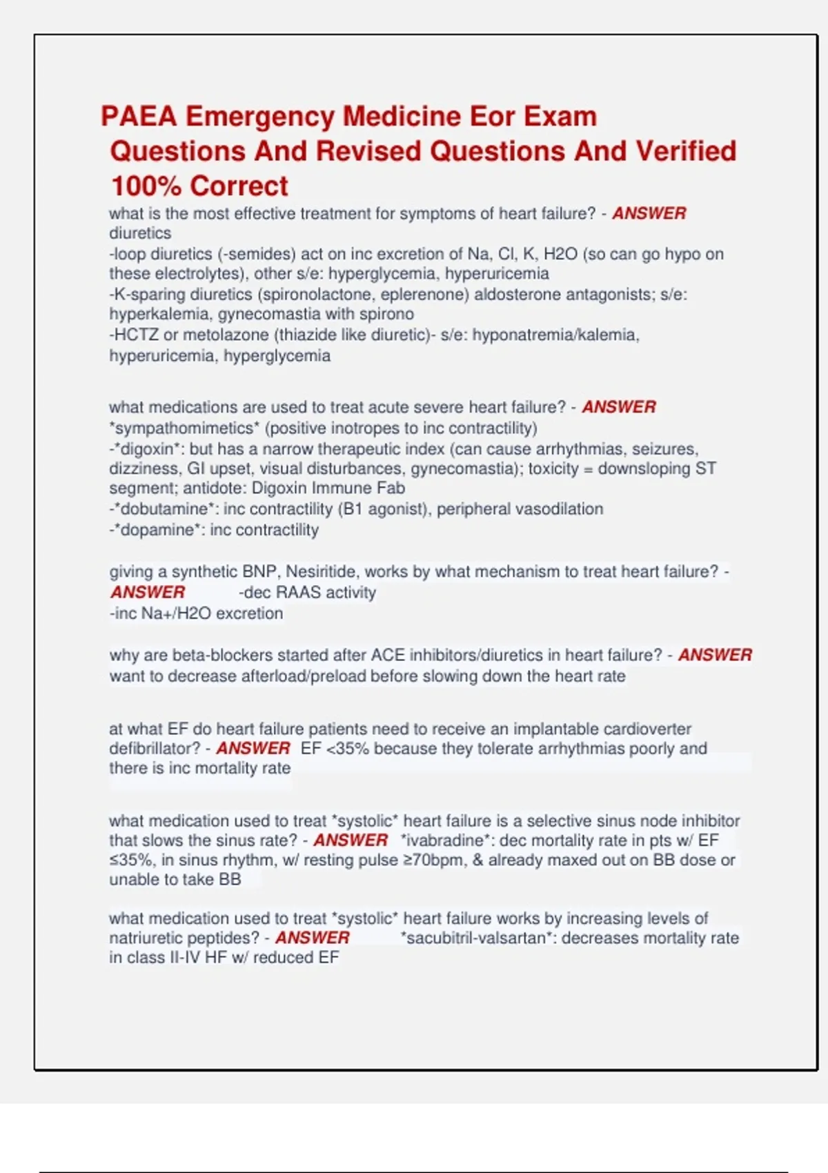 PAEA Emergency Medicine Eor Exam Questions And Revised Questions And Verified 100% Correct what is the most effective treatment for symptoms of heart failure? - ANSWER diuretics -loop diuretics (-semides) act on inc excretion of Na, Cl, K, H2O (so can go hypo on these electrolytes), other s/e: hyperglycemia, hyperuricemia -K-sparing diuretics (spironolactone, eplerenone) aldosterone antagonists; s/e: hyperkalemia, gynecomastia with spirono -HCTZ or metolazone (thiazide like diuretic)- s/e: hyponatremia/kalemia, hyperuricemia, hyperglycemia what medications are used to treat acute severe heart failure? - ANSWER *sympathomimetics* (positive inotropes to inc contractility) -*digoxin*: but has a narrow therapeutic index (can cause arrhythmias, seizures, dizziness, GI upset, visual disturbances, gynecomastia); toxicity = downsloping ST segment; antidote: Digoxin Immune Fab -*dobutamine*: inc contractility (B1 agonist), peripheral vasodilation -*dopamine*: inc contractility giving a synthetic BNP, Nesiritide, works by what mechanism to treat heart failure? - ANSWER -dec RAAS activity -inc Na+/H2O excretion why are beta-blockers started after ACE inhibitors/diuretics in heart failure? - ANSWER want to decrease afterload/preload before slowing down the heart rate at what EF do heart failure patients need to receive an implantable cardioverter defibrillator? - ANSWER EF <35% because they tolerate arrhythmias poorly and there is inc mortality rate what medication used to treat *systolic* heart failure is a selective sinus node inhibitor that slows the sinus rate? - ANSWER *ivabradine*: dec mortality rate in pts w/ EF ≤35%, in sinus rhythm, w/ resting pulse ≥70bpm, & already maxed out on BB dose or unable to take BB what medication used to treat *systolic* heart failure works by increasing levels of natriuretic peptides? - ANSWER *sacubitril-valsartan*: decreases mortality rate in class II-IV HF w/ reduced EF what is the treatment for acute pulmonary edema/congestive (aka decompensated) heart failure? - ANSWER *LMNOP* -*L*asix: removes fluids- improves sx's -*M*orphine: reduces preload reducing heart strain -*N*itrates: vasodilator to reduce pre/afterload -*O*xygen -*P*osition: upright to dec venous return if severe may also need inotropic support although primary HTN makes up 95% of cases, when should secondary HTN be considered? what are some causes of secondary HTN? - ANSWER -if refractory to antihypertensives or severely elevated -causes: *renal artery stenosis*, fibromuscular dysplasia, atherosclerosis, 1° hyperaldosteronism, pheochromocytoma, cushing's syndrome, coarctation of the aorta, sleep apnea, EtOH, OCPs, COX-2 inhibitors what are the complications of HTN? - ANSWER -CV (CAD, HF, MI, LVH, aortic dissection, aortic aneurysm, PVD) -neurologic (TIA, CVA, rutured aneurysms, encephalopathy) -nephropathy (renal stenosis & sclerosis leading to ESRD) -optic (retinal hemorrhage, blindness, retinopathy) thiazide type diuretics (HCTZ, chlorthalidone, metolazone) act on what part of the nephron to increase water excretion? what are the side effects? - ANSWER - distal diluting tubule -s/e: hyponatremia/kalemia/calcemia, hyperuricemia/glycemia (use w/ caution in gout and DM pts) *these are 1st line in uncomplicated HTN loop diuretics (furosemide, bumetanide) are the strongest class of diuretics and can cause s/e's of volume depletion, hypokalemia/natremia/calcemia, hyperuricemia/glycemia, hypochloremic metabolic alkalosis, and ototoxicity; what are they contraindicated in? - ANSWER sulfa allergy what are the DHP (dihydropyridine) and non-DHP calcium channel blockers? what are they indicated and contraindicated in? - ANSWER -DHP CCBs: nife*dipine*, amlo*dipine* (potent vasodilators) -non-DHP CCBs: verapamil, diltiazem (vasodilators but also act on heart to dec contractility and conduction/HR) so often used in pts w/ HTN w/ concomitant Afib -indications: HTN, angina, raynauds -contraindications: CHF (esp non-DHPs), 2nd/3rd degree heart block what are the cardioselective and nonselective beta blockers? - ANSWER - cardioselection (B1): atenolol, metoprolol, esmolol -nonselective (B1, B2): propranolol -a, B1, B2: labetalol, carvedilol what are contraindications for using beta-blockers? - ANSWER -2nd/3rd degree heart block, decompensated heart failure -specifically in nonselective agents: asthma/COPD, may worsen PVD or raynauds, hypotension, or pulse <50 what is the pathophysiology behind a hypertensive urgency/emergency? - ANSWER -abrupt rise in BP -increase in SVR (systemic vascular resistance) -endothelial cell deterioration a murmur that is accentuated by sitting up and leaning forward is due to what valve malfunctioning? murmur accentuated by lying on left side? - ANSWER -sitting up/leaning forward = aortic murmurs (AS, AR) -lying on left side = mitral (MS, MR) what is the MC valvular disease? - ANSWER aortic stenosis (can lead to obstruction, LVH then LV failure) what are the causes of aortic stenosis? - ANS WER -degenerative: calcifications (atherosclerotic/wear & tear in pts >70y -congenital heart dz: bicuspid valve in pts <70y -rheumatic heart dz: from strep what are the clinical manifestations of symptomatic (<1cm^2) aortic stenosis? - ANSWER -dyspnea -*angina* -*syncope* (extertional) -*CHF* a systolic "ejection" crescendo-decrescendo murmur at right upper sternal border that *radiates to carotid/neck*; decreases in intensity with valsalva/standing/handgrip (inc venous return) and increases with squatting/leg raise/sitting/leaning forward (dec venous return); *narrowed pulse pressure* - ANSWER aortic stenosis