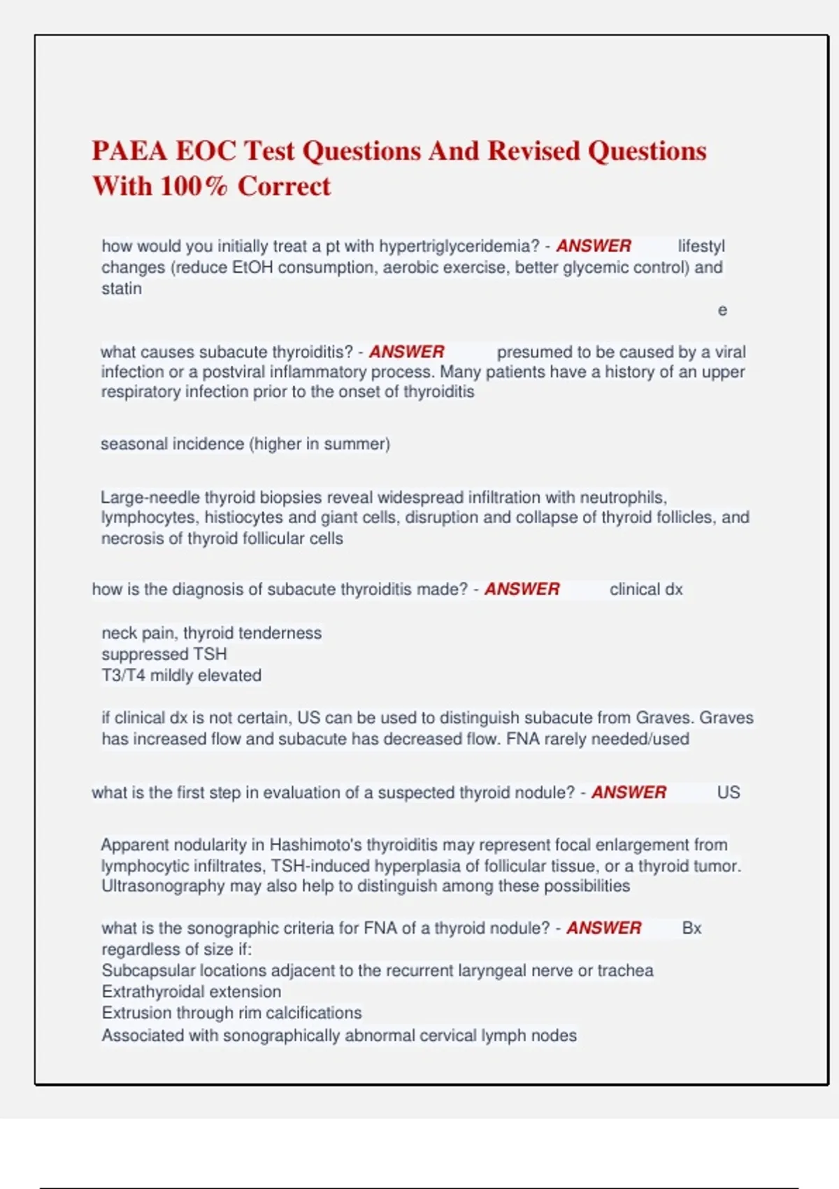PAEA EOC Test Questions And Revised Questions With 100% Correct e what causes subacute thyroiditis? - ANSWER presumed to be caused by a viral infection or a postviral inflammatory process. Many patients have a history of an upper respiratory infection prior to the onset of thyroiditis seasonal incidence (higher in summer) Large-needle thyroid biopsies reveal widespread infiltration with neutrophils, lymphocytes, histiocytes and giant cells, disruption and collapse of thyroid follicles, and necrosis of thyroid follicular cells how is the diagnosis of subacute thyroiditis made? - ANSWER clinical dx neck pain, thyroid tenderness suppressed TSH T3/T4 mildly elevated if clinical dx is not certain, US can be used to distinguish subacute from Graves. Graves has increased flow and subacute has decreased flow. FNA rarely needed/used what is the first step in evaluation of a suspected thyroid nodule? - ANSWER US Apparent nodularity in Hashimoto's thyroiditis may represent focal enlargement from lymphocytic infiltrates, TSH-induced hyperplasia of follicular tissue, or a thyroid tumor. Ultrasonography may also help to distinguish among these possibilities what is the sonographic criteria for FNA of a thyroid nodule? - ANSWER Bx regardless of size if: Subcapsular locations adjacent to the recurrent laryngeal nerve or trachea Extrathyroidal extension Extrusion through rim calcifications Associated with sonographically abnormal cervical lymph nodes how would you initially treat a pt with hypertriglyceridemia? - ANSWER lifestyl changes (reduce EtOH consumption, aerobic exercise, better glycemic control) and statin Bx if > 1cm and: Irregular margins Microcalcifications Taller than wide shape Rim calcifications with extrusion of soft tissue what makes up aspirin exacerbated respiratory disease (or NSAID-exacerbated respiratory disease)? - ANSWER asthma, chronic rhinosinusitis (CRS) with nasal polyposis, and acute upper and lower respiratory tract reactions symptoms of nasal congestion and bronchoconstriction typically begin 20 minutes to 3 hours after administration what type of allergy is aspirin exacerbated respiratory diseaase (AERD)? - ANSWER pseudoallergy, not IgE mediated In contrast, IgE-mediated "allergic" reactions result from the formation of antibodies against a specific drug, haptenated drug, or a group of structurally similar drugs how would you treat otitis externa? what if the TM is perforated? - ANSWER mild disease - topical acetic acid + hydrocortisone moderate disease - topical abx + steroid to cover staph and pseudomonas (first line consider quinolones (cipro) or polymyxin-neomycin to cover both) Preparations containing aminoglycosides should be avoided in ears where the integrity of the tympanic membrane cannot be confirmed Treatment approach to HSV-1? - ANSWER Acyclovir has the greatest in vitro activity against HSV-1 and HSV-2. However, famciclovir and valacyclovir have greater oral bioavailability than acyclovir and are dosed less frequently HSV-1 oral leads to gingivostomatitis. usually self limiting but treat if symptomatic. earlier the tx the better it works Pt has an acute onset of eye pain, vision blurring, and discharge. On physical exam you see dendritic lesions on the cornea. Dx? - ANSWER herpes simplex keratitis how is the dx of herpes simplex keratitis established? - ANSWER mostly clinical Dx should be made in conjunction with an ophthalmologist if dx uncertain can use detection of viral DNA via PCR testing from intraocular fluid what is the best imaging for suspected ludwig's angina or other deep neck space infections? - ANSWER CT is the imaging modality of choice Where does Ludwig angina infection most commonly arise from? - ANSWER an infected second or third mandibular molar tooth infection moves to the sublingual and submaxillary space bilaterally aggressive, rapidly spreading cellulitis, WITHOUT lymphadenopathy Pt in ED is unresponsive and noted to be in ventricular fibrillation on the monitor. What interventions should be initiated? - ANSWER intervention: unsynchronized cardioversion, start CPR Pt is newly diagnosed with WPW. What is the intervention for the following: -stable (wide complex) tachycardia -unstable -definitive - ANSWER -stable: 1st line procainamide. Amiodarone -unstable: synchronized cardioversion -definitive: radio frequency catheter ablation criteria and therapeutics for hypertensive emergency? - ANSWE R SBP > 180 and/or DBP >120 WITH EVIDENCE OF END ORGAN DAMAGE sodium nitroprusside what are some topical agents that can be used for painful external hemorrhoids? - ANSWER topical vasoactive agents: nitroglycerin (helpful for thrombosed), phenylephrine (aka prep H, relief for acute sx) topical corticosteroids for short term analgesic/inflammation relief - hydrocortisone (Anusol) local topical anesthetics for pain/pruritus (benzocaine, dibucaine) zinc oxide paste how would you treat symptomatic internal hemorrhoids? - ANS WER rubber band ligation (cannot use on external hemorrhoids, extremely painful)