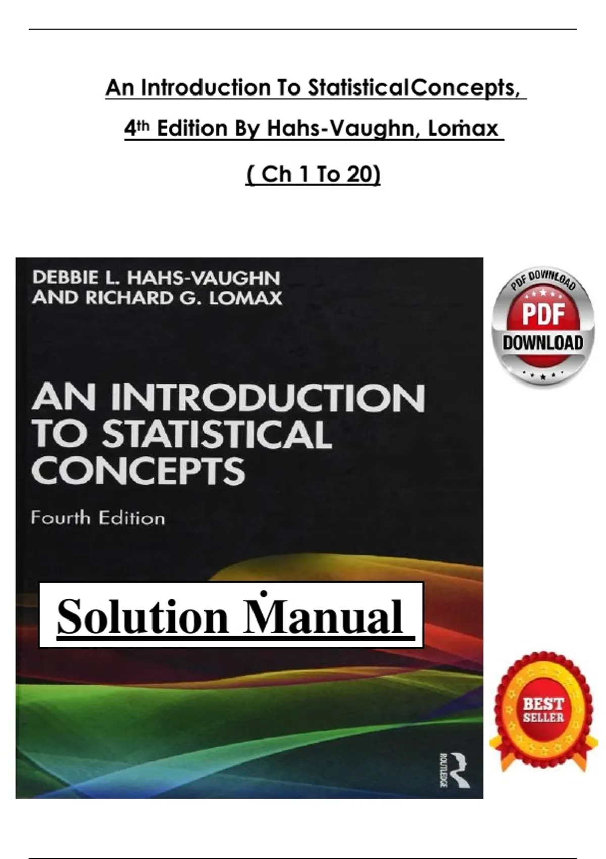 This solutions manual for An Introduction to Statistical Concepts, 4th Edition by Hahs-Vaughn & Lomax, covers Chapters 1–20. It includes fully worked solutions for exercises, helping students understand fundamental statistical concepts, probability, hypothesis testing, correlation, regression, and data analysis techniques. Designed for undergraduate students in statistics or research methods courses, this manual supports exam preparation and practical application of statistical principles. statistics, solutions manual, Hahs-Vaughn, Lomax, STA101, probability, hypothesis testing, regression, correlation, data analysis, chapters 1-20, statistical concepts