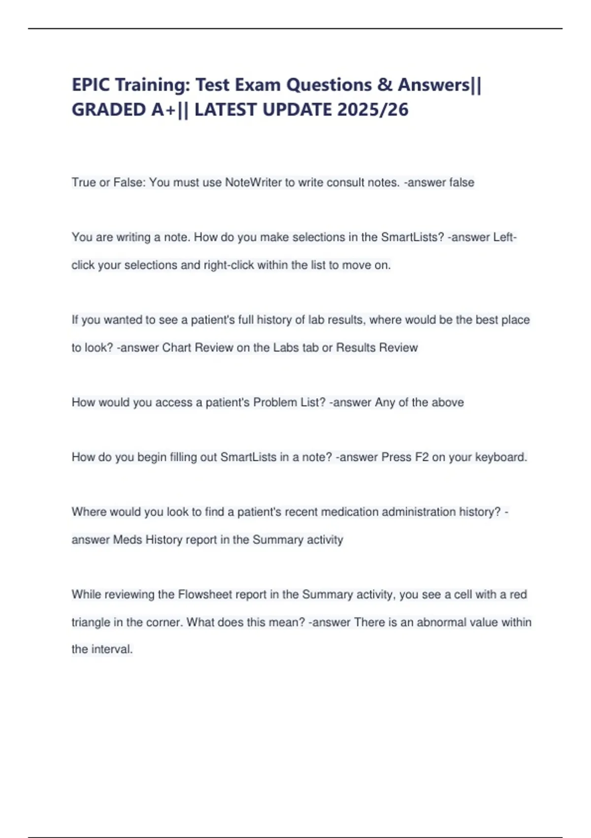 EPIC Training: Test Exam Questions & Answers||