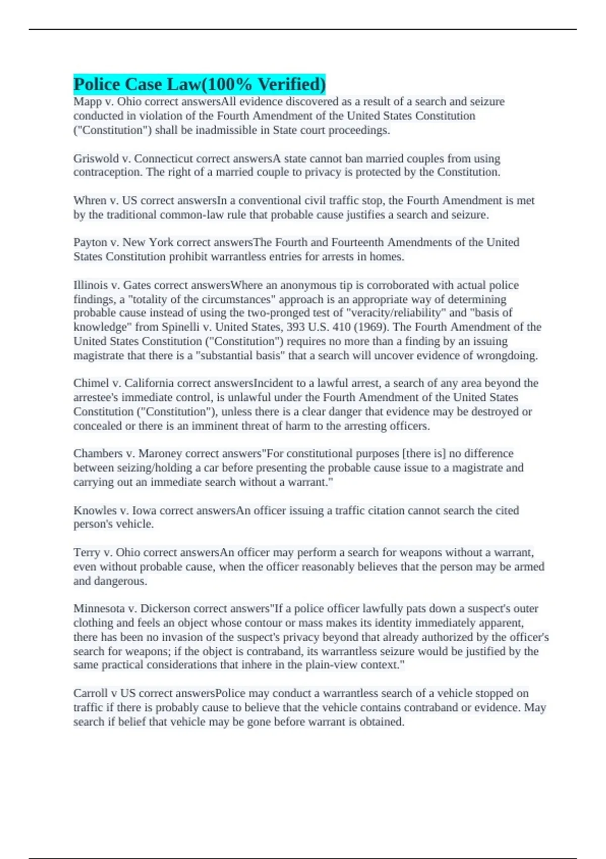Mapp v. Ohio correct answersAll evidence discovered as a result of a search and seizure conducted in violation of the Fourth Amendment of the United States Constitution ("Constitution") shall be inadmissible in State court proceedings. Griswold v. Connecticut correct answersA state cannot ban married couples from using contraception. The right of a married couple to privacy is protected by the Constitution. Whren v. US correct answersIn a conventional civil traffic stop, the Fourth Amendment is met by the traditional common-law rule that probable cause justifies a search and seizure. Payton v. New York correct answersThe Fourth and Fourteenth Amendments of the United States Constitution prohibit warrantless entries for arrests in homes. Illinois v. Gates correct answersWhere an anonymous tip is corroborated with actual police findings, a "totality of the circumstances" approach is an appropriate way of determining probable cause instead of using the two-pronged test of "veracity/reliability" and "basis of knowledge" from Spinelli v. United States, 393 U.S. 410 (1969). The Fourth Amendment of the United States Constitution ("Constitution") requires no more than a finding by an issuing magistrate that there is a "substantial basis" that a search will uncover evidence of wrongdoing. Chimel v. California correct answersIncident to a lawful arrest, a search of any area beyond the arrestee's immediate control, is unlawful under the Fourth Amendment of the United States Constitution ("Constitution"), unless there is a clear danger that evidence may be destroyed or concealed or there is an imminent threat of harm to the arresting officers. Chambers v. Maroney correct answers"For constitutional purposes [there is] no difference between seizing/holding a car before presenting the probable cause issue to a magistrate and carrying out an immediate search without a warrant." Knowles v. Iowa correct answersAn officer issuing a traffic citation cannot search the cited person's vehicle. Terry v. Ohio correct answersAn officer may perform a search for weapons without a warrant, even without probable cause, when the officer reasonably believes that the person may be armed and dangerous. Minnesota v. Dickerson correct answers"If a police officer lawfully pats down a suspect's outer clothing and feels an object whose contour or mass makes its identity immediately apparent, there has been no invasion of the suspect's privacy beyond that already authorized by the officer's search for weapons; if the object is contraband, its warrantless seizure would be justified by the same practical considerations that inhere in the plain-view context." Carroll v US correct answersPolice may conduct a warrantless search of a vehicle stopped on traffic if there is probably cause to believe that the vehicle contains contraband or evidence. May search if belief that vehicle may be gone before warrant is obtained.