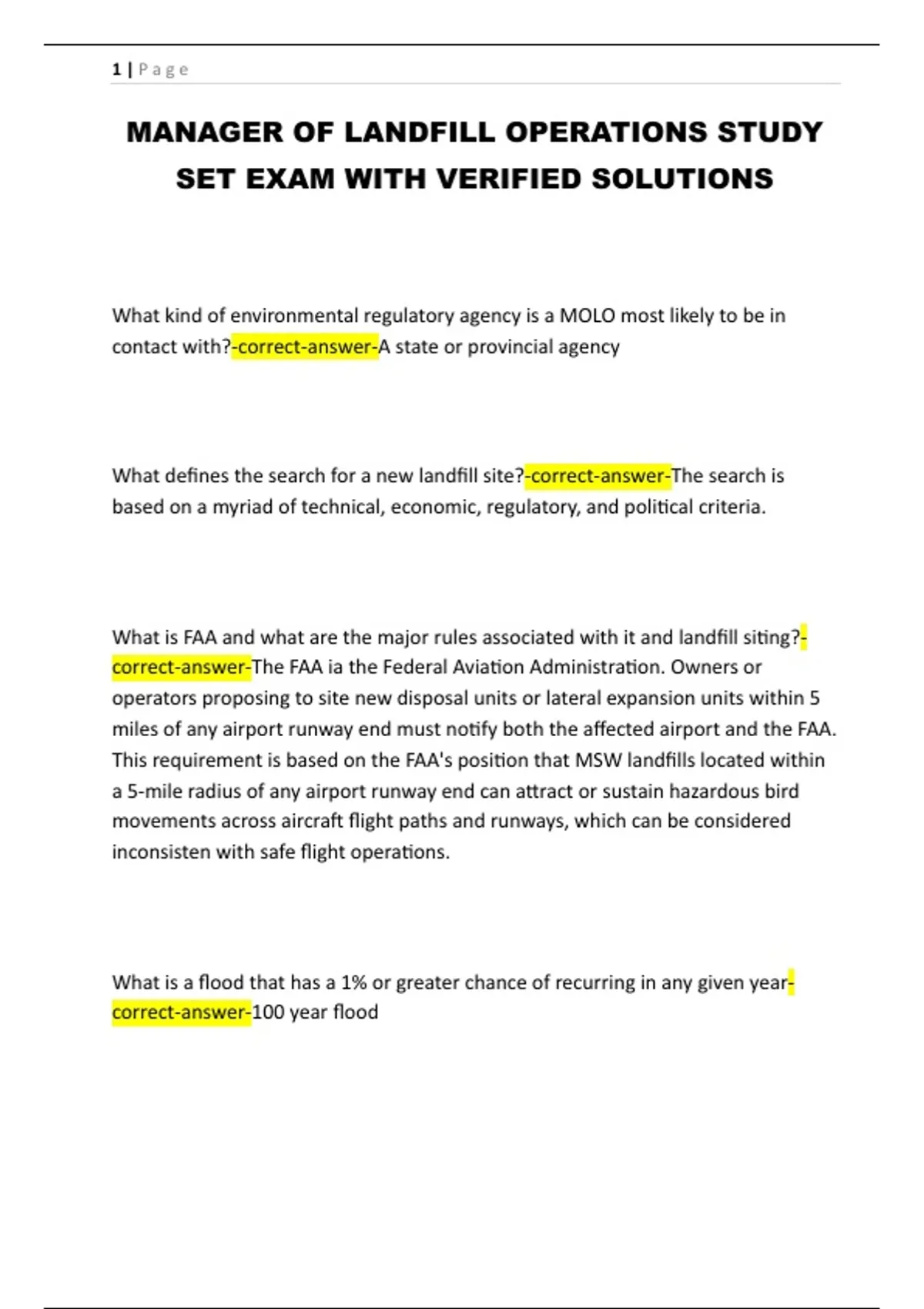 MANAGER OF LANDFILL OPERATIONS STUDY SET EXAM WITH VERIFIED SOLUTIONS