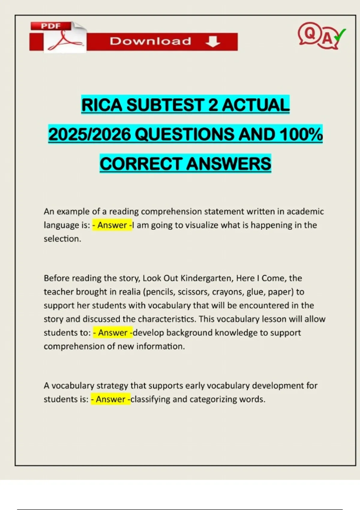 RICA SUBTEST 2 ACTUAL 2025/2026 QUESTIONS AND 100% CORRECT ANSWERS An example of a reading comprehension statement written in academic language is: - Answer -I am going to visualize what is happening in the selection. Before reading the story, Look Out Kindergarten, Here I Come, the teacher brought in realia (pencils, scissors, crayons, glue, paper) to support her students with vocabulary that will be encountered in the story and discussed the characteristics. This vocabulary lesson will allow students to: - Answer -develop background knowledge to support comprehension of new information. A vocabulary strategy that supports early vocabulary development for students is: - Answer -classifying and categorizing words.Need assistance on Online classes, Exams & Assignments? Reach out for instant help!! Full Course Assistance, Plagiarism-free Essay Writing, Research Paper, Dissertation, Discussion Posts, etc…. Confidential & Secure services. Tutors are available for all subjects! Email now at: The "Matthew Effect", which relates to vocabulary, can be explained as: - Answer -a term used by a psychologist that describes how readers acquire large vocabularies by reading extensively, which widens the gap of knowledge between them and the students who read less. During independent reading of an expository text about dinosaurs, the students in a second-grade class had difficulty with the vocabulary words "prehistoric ooze". Which of the following is the best strategy to support students' understanding of the complex vocabulary? - Answer - Before reading, introduce the meaning of target vocabulary and explain words one at a time using student-friendly explanations. According to research, most students learn vocabulary indirectly.