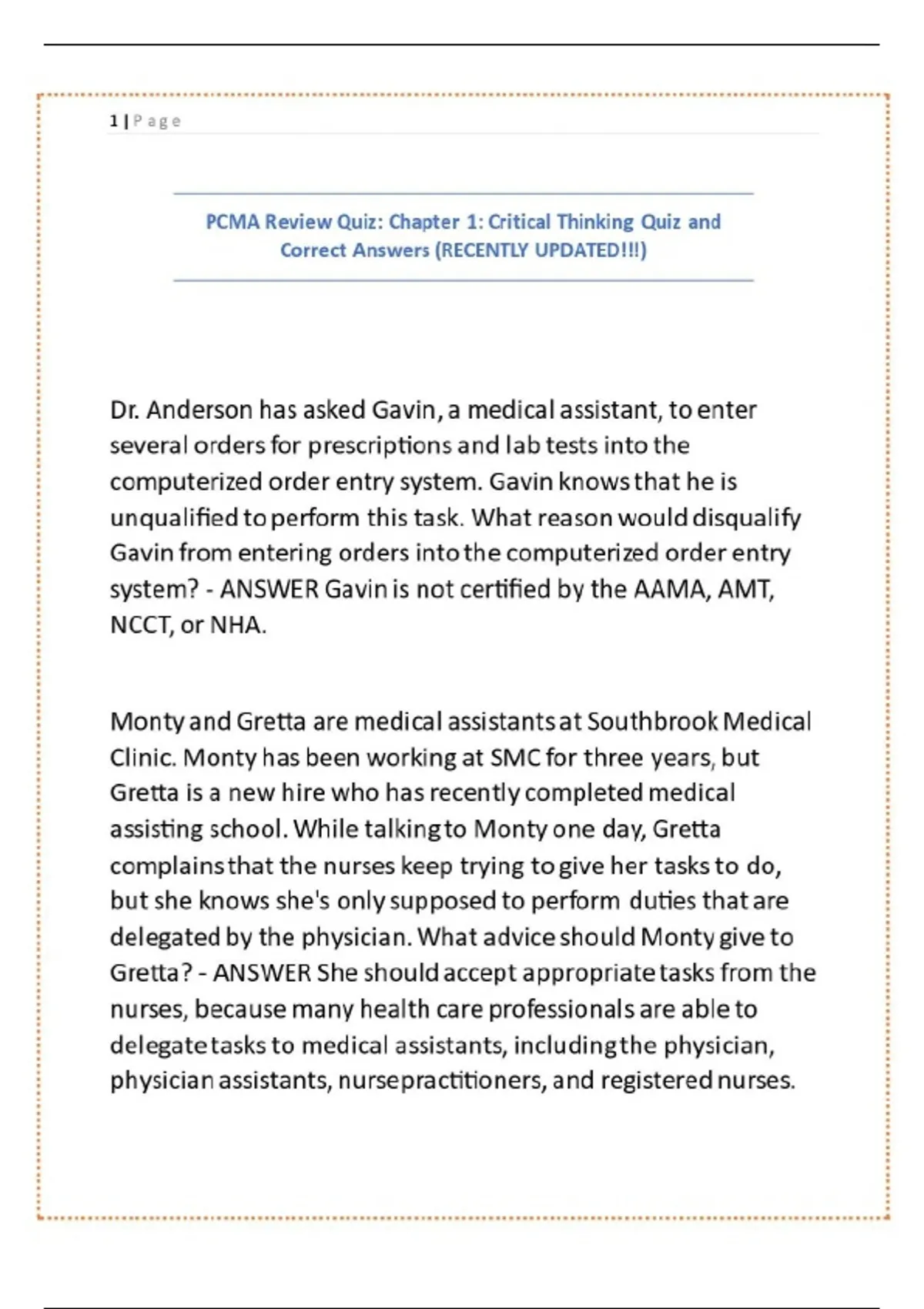 PCMA Review Quiz Chapter 1 Critical Thinking Quiz and Correct Answers (RECENTLY UPDATED!!!)