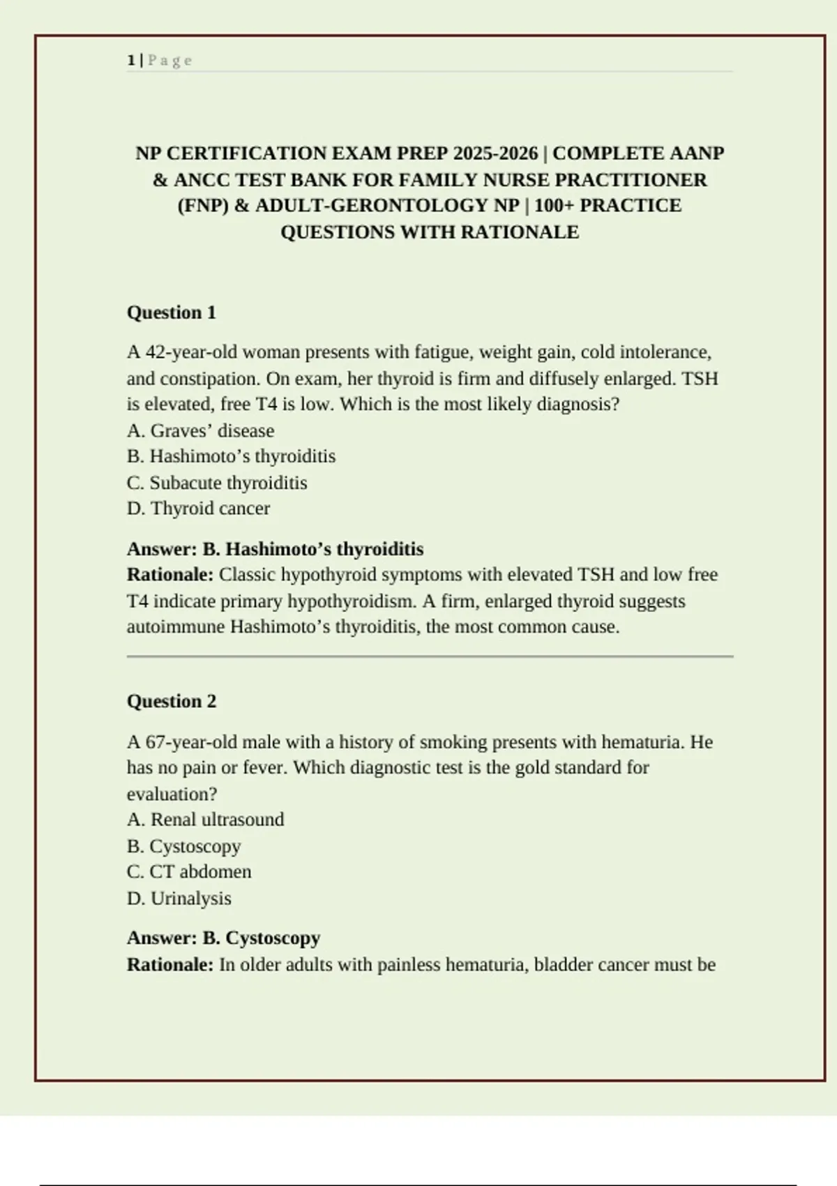 NP CERTIFICATION EXAM PREP | COMPLETE AANP & ANCC TEST BANK FOR FAMILY NURSE PRACTITIONER (FNP) & ADULT-GERONTOLOGY NP | 100+ PRACTICE QUESTIONS WITH RATIONALE