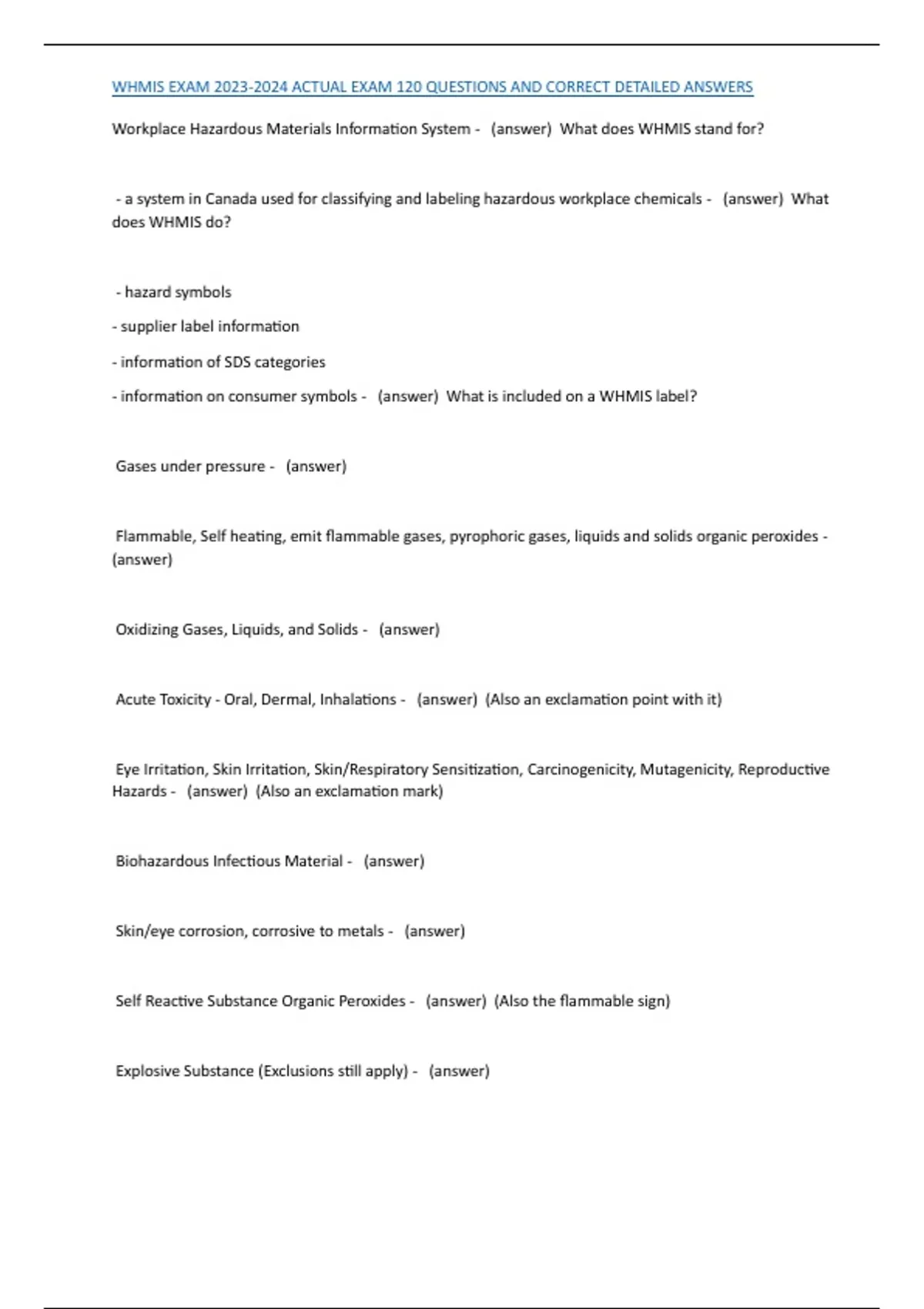 WHMIS EXAM 2023-2024 ACTUAL EXAM 120 QUESTIONS AND CORRECT DETAILED ANSWERS