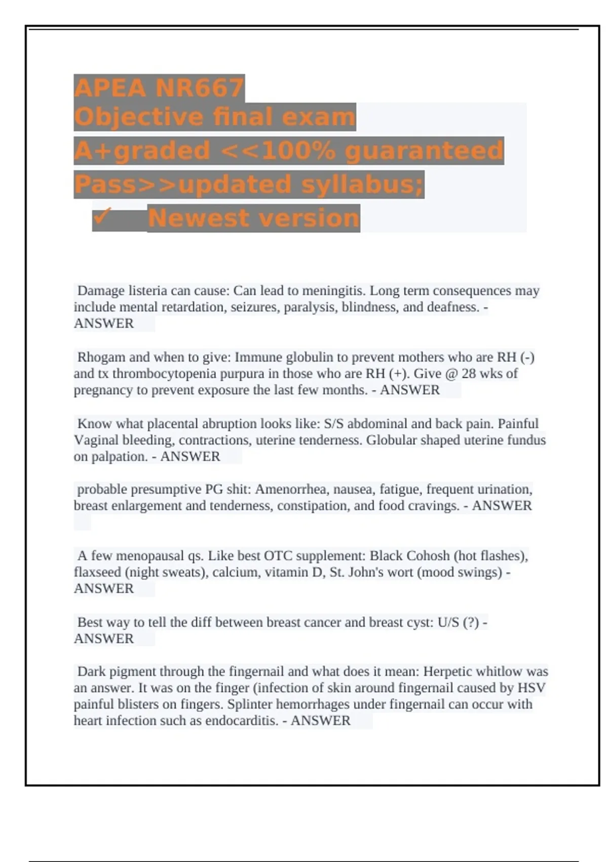 APEA NR667 Objective final exam A+graded 100% guaranteed Passupdated syllabus;  Newest version Damage listeria can cause: Can lead to meningitis. Long term consequences may include mental retardation, seizures, paralysis, blindness, and deafness. - ANSWER Rhogam and when to give: Immune globulin to prevent mothers who are RH (-) and tx thrombocytopenia purpura in those who are RH (+). Give @ 28 wks of pregnancy to prevent exposure the last few months. - ANSWER Know what placental abruption looks like: S/S abdominal and back pain. Painful Vaginal bleeding, contractions, uterine tenderness. Globular shaped uterine fundus on palpation. - ANSWER probable presumptive PG shit: Amenorrhea, nausea, fatigue, frequent urination, breast enlargement and tenderness, constipation, and food cravings. - ANSWER A few menopausal qs. Like best OTC supplement: Black Cohosh (hot flashes), flaxseed (night sweats), calcium, vitamin D, St. John's wort (mood swings) - ANSWER Best way to tell the diff between breast cancer and breast cyst: U/S (?) - ANSWER Dark pigment through the fingernail and what does it mean: Herpetic whitlow was an answer. It was on the finger (infection of skin around fingernail caused by HSV painful blisters on fingers. Splinter hemorrhages under fingernail can occur with heart infection such as endocarditis. - ANSWER One was like a baby was tx for uti extensively and what next. It was weird answers. Kidney US. Nothing. Abdominal US. According to APEA videos it would be a renal and bladder u/s for next step after abx (cephlasporins such as cefixime, cefdinir, ceftibuten 3-5 days if afebrile and 10 days if febrile). - ANSWER Know GFR is top for kidney function. Under 30 stop metformin - GFR 60 is normal - ANSWER UTI tx. Bactrim DS (sulfa), Cipro (fluroquinolone), Nitrofurantin (Macrobid). Cephalosporins reserve for children and pregnant women. Cephalexin, Amoxil, Augmentin (1st trimester) and Nitrofurantin 100mg (2nd and 3rd trimester). - ANSWER And Pyelo and what diagnostic tool: Pyelonephritis is kidney infection that requires hospitalization can cause complications such as abscesses, renal damage, sepsis, renal failure, and death. Dx testing: U/A with positive WBC casts, CBC: leukocytosis, increase sed rate. Blood culture and CT if septic. Fluoroquinolone tx preferred such as Cipro. - ANSWER Ch and Gh = doxy 100mg BID x 7 days and rocephin (ceftriaxone) 500mg IM if 330lb, if 330lbs than 1gm IM. - ANSWER Ch=doxy 100mg BID x 7 days. Alternative: azithromycin 1gm oral single dose or levo 500mg daily x 7. In pregnancy Azithromycin 1 gm oral single dose or Amoxil 500 mg TID for 7 days. Rescreen in 3 mos due to rates of reinfection and f/u in 1 mo if pregnant. - ANSWER Symptoms of chlamydia is vaginal/urethral white/gray discharge, dysuria, mild abdominal pain, cervical motion tenderness, salpingitis, edematous/congested/friable cervix. In women can manifest as cervicitis, urethritis, PID. Untreated risk for infertility and ectopic preg. In men can lead to urethritis, epididymitis, prostatitis, proctitis. Conjunctivitis and pharyngitis in both men and women. LABS: NAATS- highly sensitive for Ch and Gh done through vaginal swab in women and U/A in men. Pregnancy test of cure 3-4wks after tx and retest in 3rd trimester. Most common in 25yo - ANSWER
