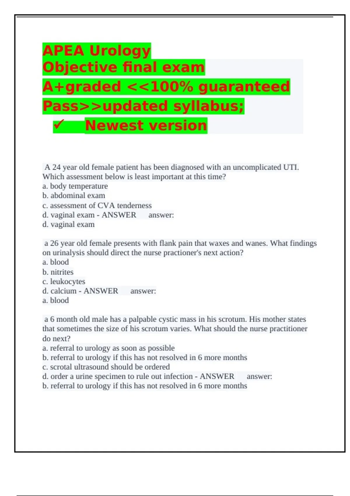 APEA Urology Objective final exam A+graded 100% guaranteed Passupdated syllabus;  Newest version A 24 year old female patient has been diagnosed with an uncomplicated UTI. Which assessment below is least important at this time? a. body temperature b. abdominal exam c. assessment of CVA tenderness d. vaginal exam - ANSWER answer: d. vaginal exam a 26 year old female presents with flank pain that waxes and wanes. What findings on urinalysis should direct the nurse practioner's next action? a. blood b. nitrites c. leukocytes d. calcium - ANSWER answer: a. blood a 6 month old male has a palpable cystic mass in his scrotum. His mother states that sometimes the size of his scrotum varies. What should the nurse practitioner do next? a. referral to urology as soon as possible b. referral to urology if this has not resolved in 6 more months c. scrotal ultrasound should be ordered d. order a urine specimen to rule out infection - ANSWER answer: b. referral to urology if this has not resolved in 6 more months this is the clinical description of a hydrocele. It is very common in young males and usually resolves by a year of age. If it has not resolved by 12 months of age, the patient should be referred to urology. A physically independent 75 year old was diagnosed with mild cognitive impairment 6 months ago. She resides in an assisted living facility. She is in the clinic for a scheduled visit. Her adult daughter reports that about 2 weeks ago her mother had an episode of urinary incontinence, but no known episodes since. She is found to have asymptomatic bacteriuria. How should she be managed? a. repeat the UA in 7 days b. treat her today with one day dose of an antibiotic c. monitor her for symptoms of a urinary tract infection d. repeat the UA in 4 weeks - ANSWER answer: c. monitor her for symptoms of a urinary tract infection a female patient with a complaint of dysuria has the following urinalysis result. The most appropriate diagnosis is: positive hmg, positive leukocyte, positive nitrites, 15-20 WBC, 10 RBC, positive bacteria a. UTI b. asymptomatic bacteriuria c. UTI with hematuria d. UTI or chlamydia - ANSWER answer: c. UTI with hematuria A 55 year old patient has been found to have persistent proteinuria and chronic kidney disease is suspected. The diagnosis that is known to be the leading cause of CKD and ESKD in the US is: a. polycystic kidney disease b. peripheral arterial disease c. diabetes d. history of acute kidney injury - ANSWER answer: c. diabetes An adolescent male has had a sudden onset of severe scrotal pain following a kick in the groin earlier in the day during soccer game. How should this be managed. a. a urine specimen should be collected b. a scrotal ultrasound should be ordered c. he should be referred to the emergency room d. he should be examined carefully for a low riding testicle - ANSWER answer: c. he should be referred to the emergency room historical findings suggest testicular torsion or epididymitis