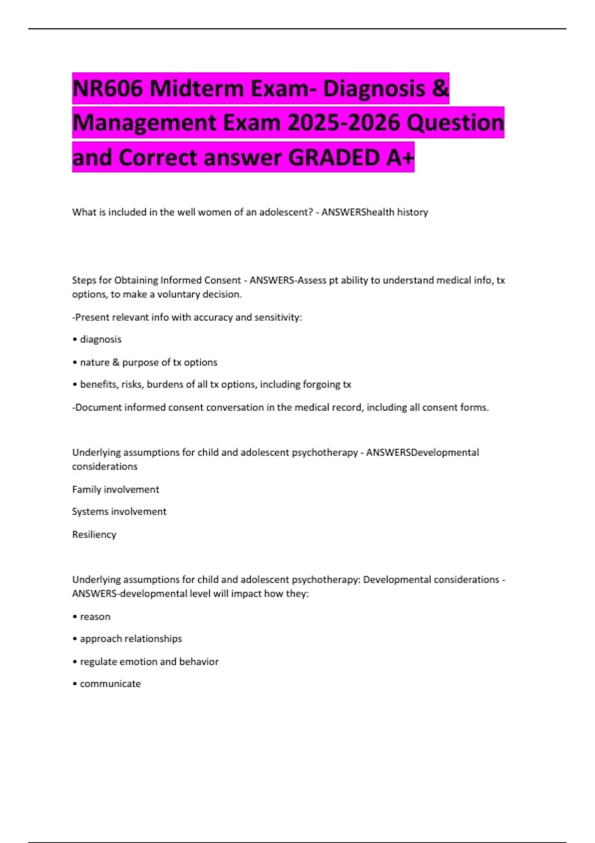NR606 Midterm Exam- Diagnosis &