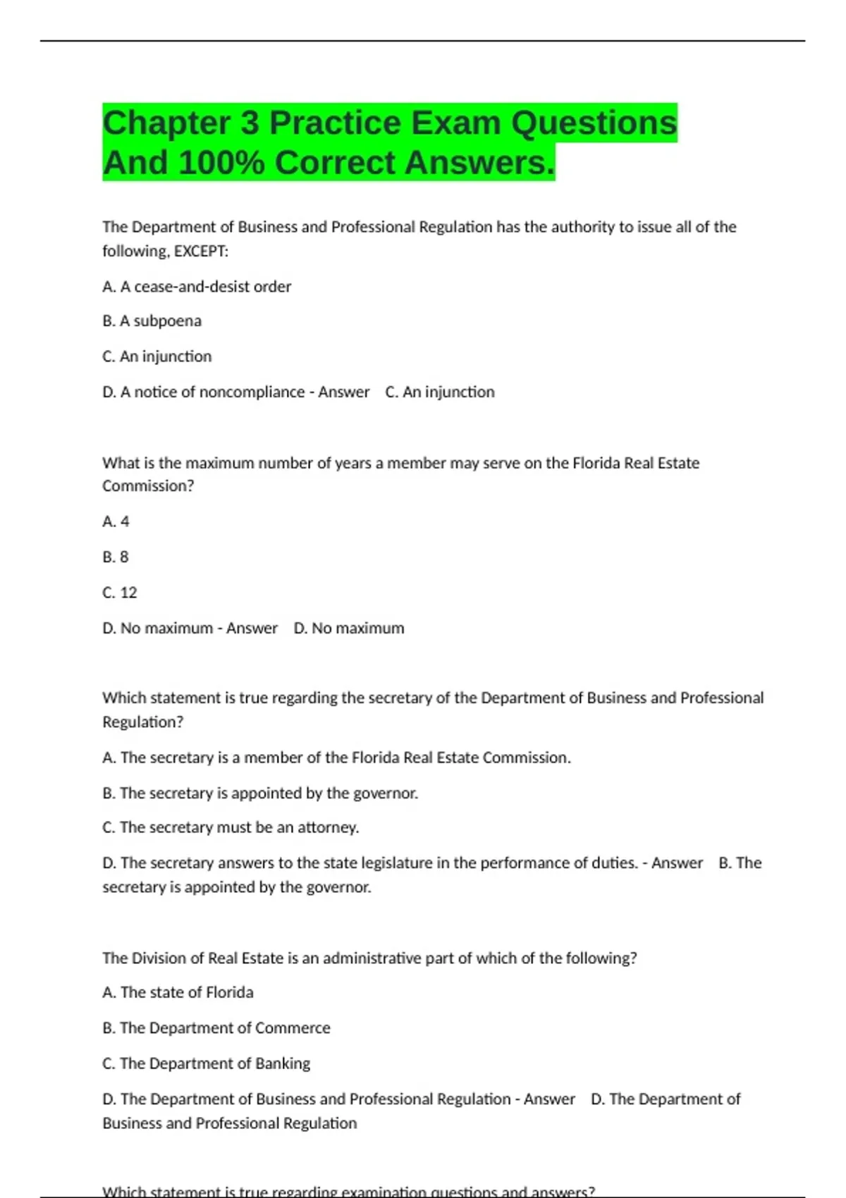 The Department of Business and Professional Regulation has the authority to issue all of the following, EXCEPT: A. A cease-and-desist order B. A subpoena C. An injunction D. A notice of noncompliance - Answer C. An injunction What is the maximum number of years a member may serve on the Florida Real Estate Commission? A. 4 B. 8 C. 12 D. No maximum - Answer D. No maximum Which statement is true regarding the secretary of the Department of Business and Professional Regulation? A. The secretary is a member of the Florida Real Estate Commission. B. The secretary is appointed by the governor. C. The secretary must be an attorney. D. The secretary answers to the state legislature in the performance of duties. - Answer B. The secretary is appointed by the governor. The Division of Real Estate is an administrative part of which of the following? A. The state of Florida B. The Department of Commerce C. The Department of Banking D. The Department of Business and Professional Regulation - Answer D. The Department of Business and Professional Regulation