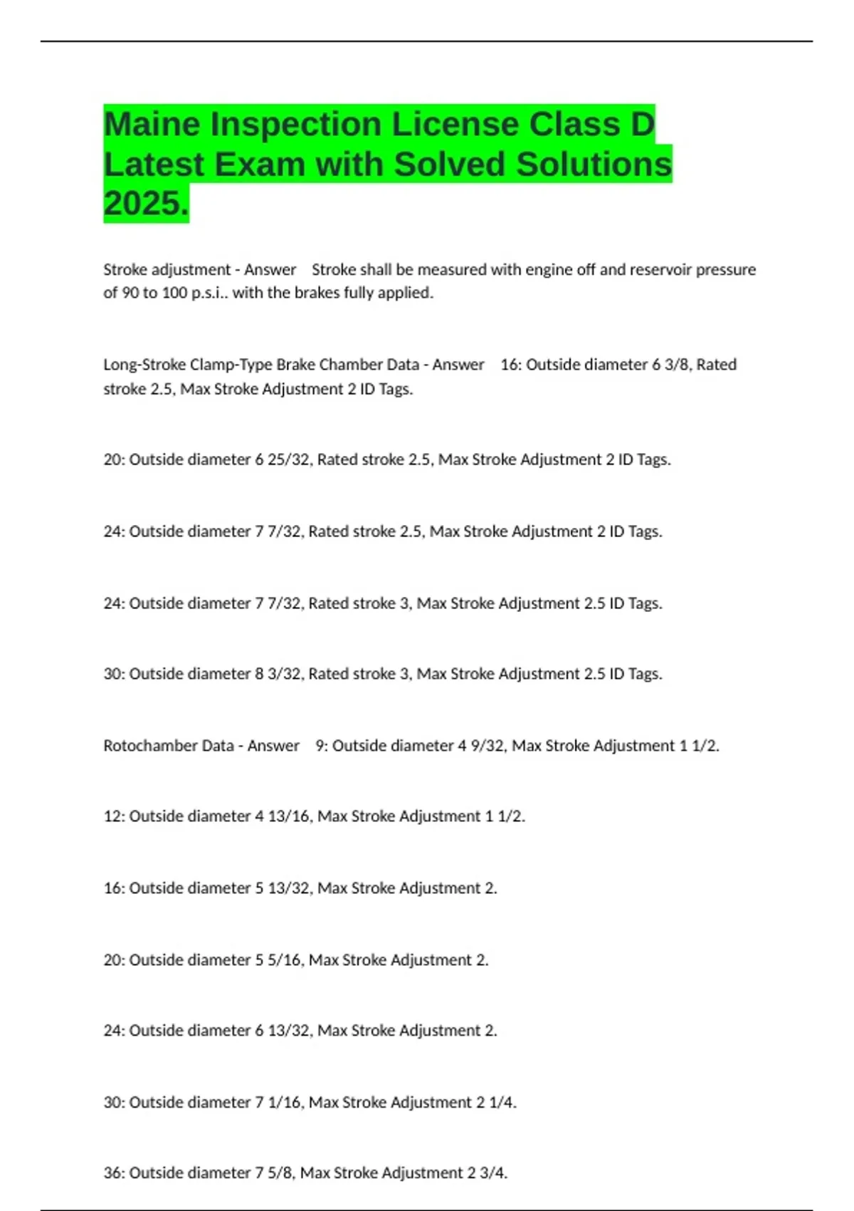 Stroke adjustment - Answer Stroke shall be measured with engine off and reservoir pressure of 90 to 100 p.s.i.. with the brakes fully applied. Long-Stroke Clamp-Type Brake Chamber Data - Answer 16: Outside diameter 6 3/8, Rated stroke 2.5, Max Stroke Adjustment 2 ID Tags. 20: Outside diameter 6 25/32, Rated stroke 2.5, Max Stroke Adjustment 2 ID Tags. 24: Outside diameter 7 7/32, Rated stroke 2.5, Max Stroke Adjustment 2 ID Tags. 24: Outside diameter 7 7/32, Rated stroke 3, Max Stroke Adjustment 2.5 ID Tags. 30: Outside diameter 8 3/32, Rated stroke 3, Max Stroke Adjustment 2.5 ID Tags. Rotochamber Data - Answer 9: Outside diameter 4 9/32, Max Stroke Adjustment 1 1/2. 12: Outside diameter 4 13/16, Max Stroke Adjustment 1 1/2. 16: Outside diameter 5 13/32, Max Stroke Adjustment 2. 20: Outside diameter 5 5/16, Max Stroke Adjustment 2. 24: Outside diameter 6 13/32, Max Stroke Adjustment 2. 30: Outside diameter 7 1/16, Max Stroke Adjustment 2 1/4. 36: Outside diameter 7 5/8, Max Stroke Adjustment 2 3/4.