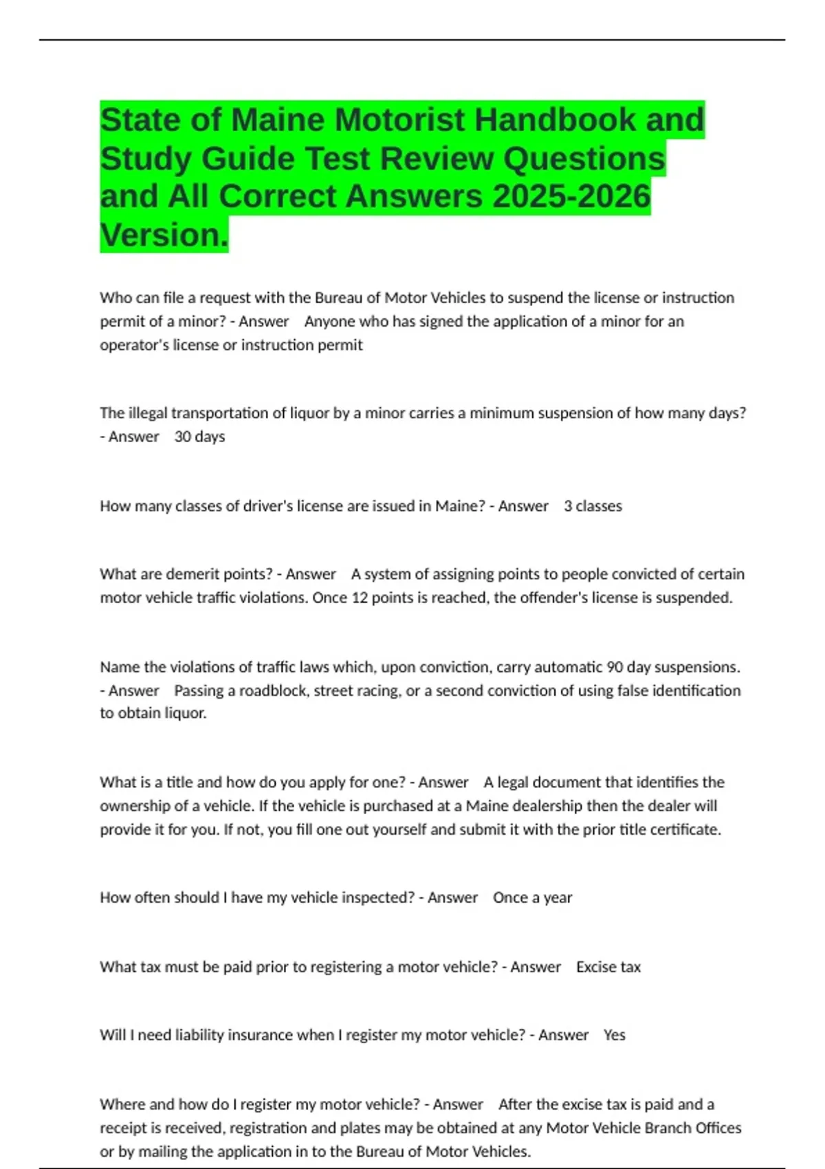 State of Maine Motorist Handbook and Study Guide Test Review Questions and All Correct Answers Version.