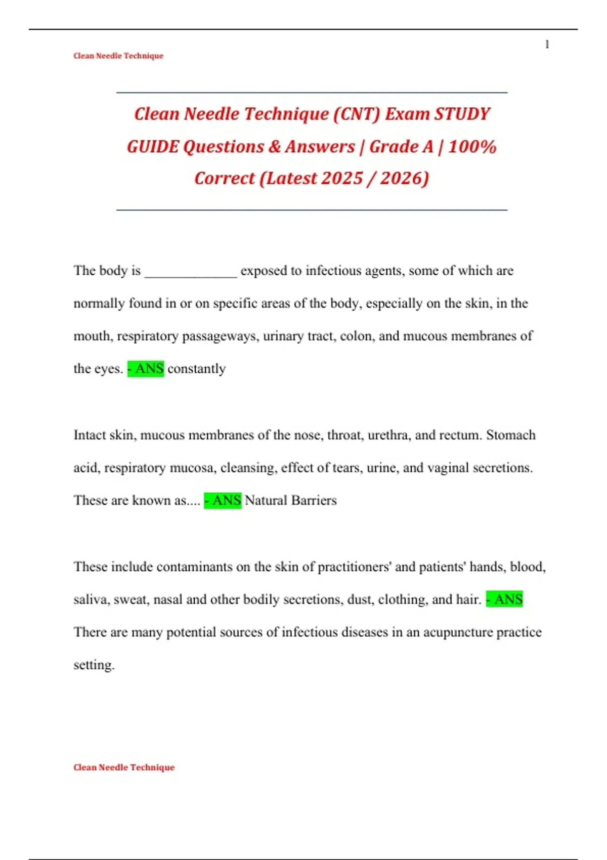 Clean Needle Technique (CNT) Exam STUDY GUIDE Questions & Answers | Grade A | 100% Correct (Latest 2025 / 2026)