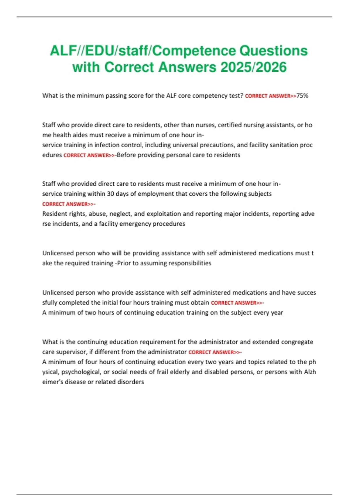 , What is the minimum passing score for the ALF core competency test CORRECT ANSWER>>75%