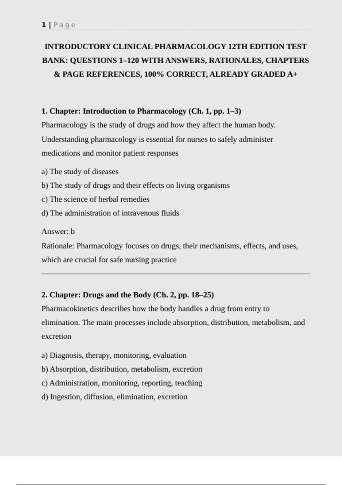 INTRODUCTORY CLINICAL PHARMACOLOGY 12TH EDITION TEST BANK: QUESTIONS 1–120 WITH ANSWERS, RATIONALES, CHAPTERS & PAGE REFERENCES, 100% CORRECT, ALREADY GRADED A+