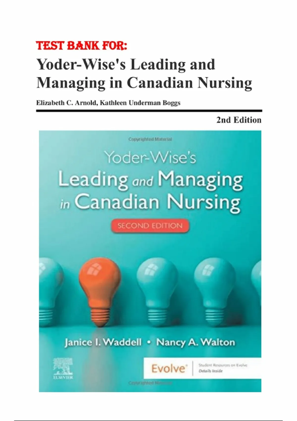 TEST BANK FOR YODER-WISE’S LEADING AND MANAGING IN CANADIAN NURSING, 2ND EDITION, PATRICIA S. YODER-WISE, JANICE WADDELL, NANCY WALTON, ISBN: 1684, ISBN: 1745, ISBN: 1677 Table of Contents Part I: Core Concepts Overview 1. Leading, Managing, and Following 2. Developing the Role of Leader 3. Developing the Role of Manager 4. Nursing Leadership and Indigenous Health 5. Patient Focus Context 6. Ethical Issues 7. Legal Issues 8. Making Decisions and Solving Problems 9. Health Care Organizations 10. Understanding and Designing Organizational Structures 11. Cultural Diversity in Health Care 12. Power, Politics, and Influence Part II: Managing Resources 13. Caring, Communicating, and Managing with Technology 14. Managing Costs and Budgets 15. Care Delivery Strategies 16. Staffing and Scheduling (available only on Evolve) 17. Selecting, Developing, and Evaluating Staff (available only on Evolve) Part III: Changing the Status Quo 18. Strategic Planning, Goal-Setting, and Marketing 19. Nurses Leading Change: A Relational Emancipatory Framework for Health and Social Action 20. Building Teams Through Communication and Partnerships 21. Collective Nursing Advocacy 22. Understanding Quality, Risk, and Safety 23. Translating Research into Practice Part IV: Interpersonal and Personal Skills Interpersonal 24. Understanding and Resolving Conflict 25. Managing Personal/Personnel Problems 26. Workplace Violence and Incivility 27. Inter and Intraprofessional Practice and Leading in Professional Practice Settings Personal 28. Role Transition 29. Self-Management: Stress and Time Future 30. Thriving for the Future 31. Leading and Managing Your Career 32. Nursing Students as Leaders
