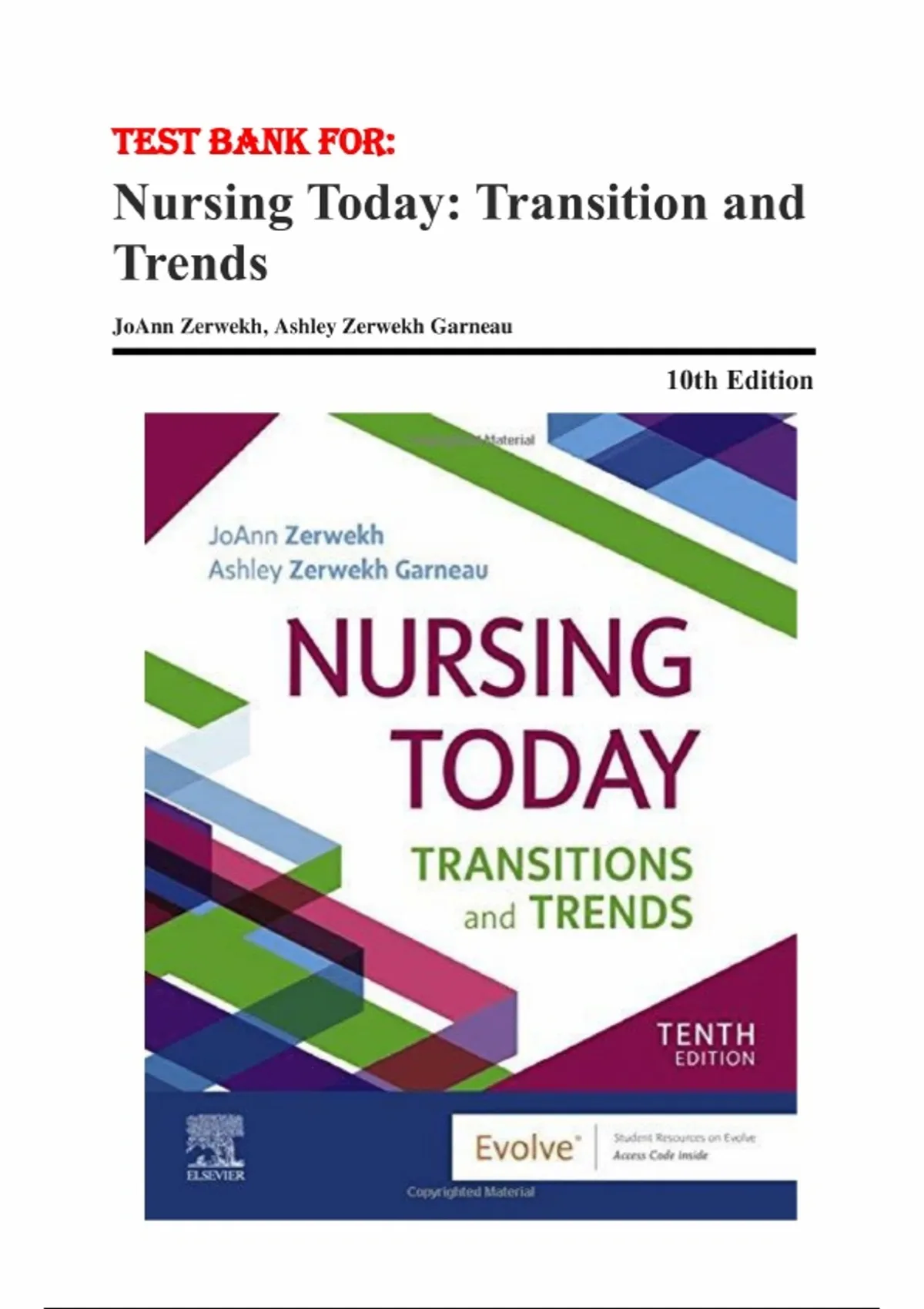 Test Bank for Nursing Today 10th Edition by JoAnn Zerwekh, Ashley Zerwekh Garneau 9780323642088 Chapter 1-26. Unit I: Professional Growth and Transition 1. Role Transitions 2. Personal Management: Time and Self-Care Strategies 3. Mentorship, Preceptorship, and Nurse Residency Programs 4. Employment Considerations: Opportunities, Resumes and Interviewing 5. NCLEX-RN Exam and the New Graduate Unit II: Nursing: A Developing Profession 6. Historical Perspectives 7. Nursing Education 8. Nursing Theories 9. Professional Image of Nursing Unit III: Nursing Management 10. Challenges of Nursing Management and Leadership 11. Building Nursing Management Skills 12. Effective Communication, Team Building, and Interprofessional Practice 13. Conflict Management 14. Delegation in the Clinical Setting Unit IV: Current Issues in Health Care 15. The Health Care Organization and Patterns of Nursing Care Delivery 16. Economics in the Health Care Delivery System 17. Political Action in Nursing 18. Collective Bargaining: Traditional (Union) and Nontraditional Approaches 19. Ethical Issues 20. Legal Issues Unit V: Contemporary Nursing Practice 21. Cultural & Spiritual Awareness 22. Quality Patient Care 23. Nursing Informatics 24. Using Evidence-Based Practice and Nursing Research 25. Workplace Issues 26. Emergency Preparedness