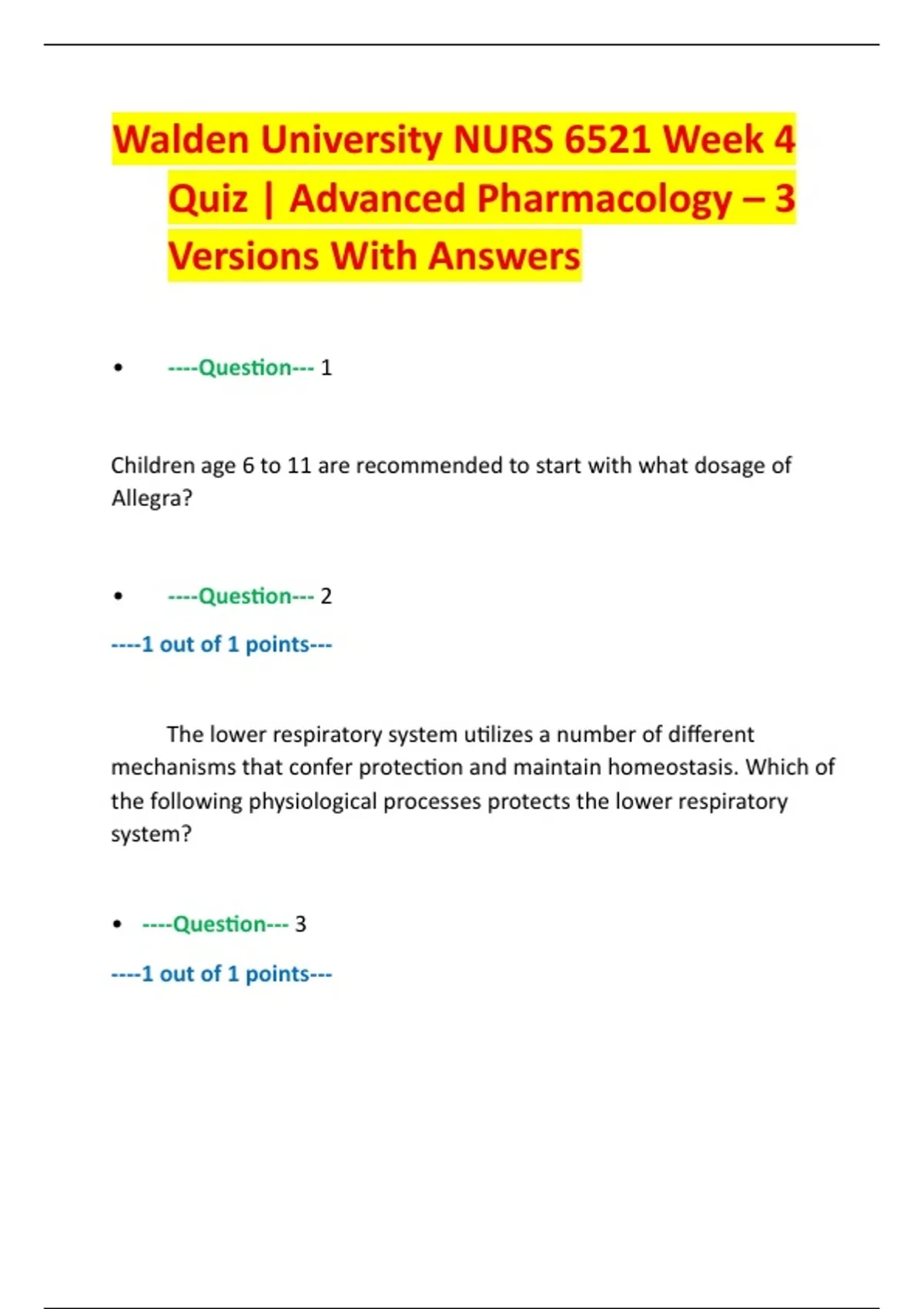 Walden University NURS 6521 Week 4 Quiz – Advanced Pharmacology | 3 Quiz Versions with Verified Answers (2025 Update)
