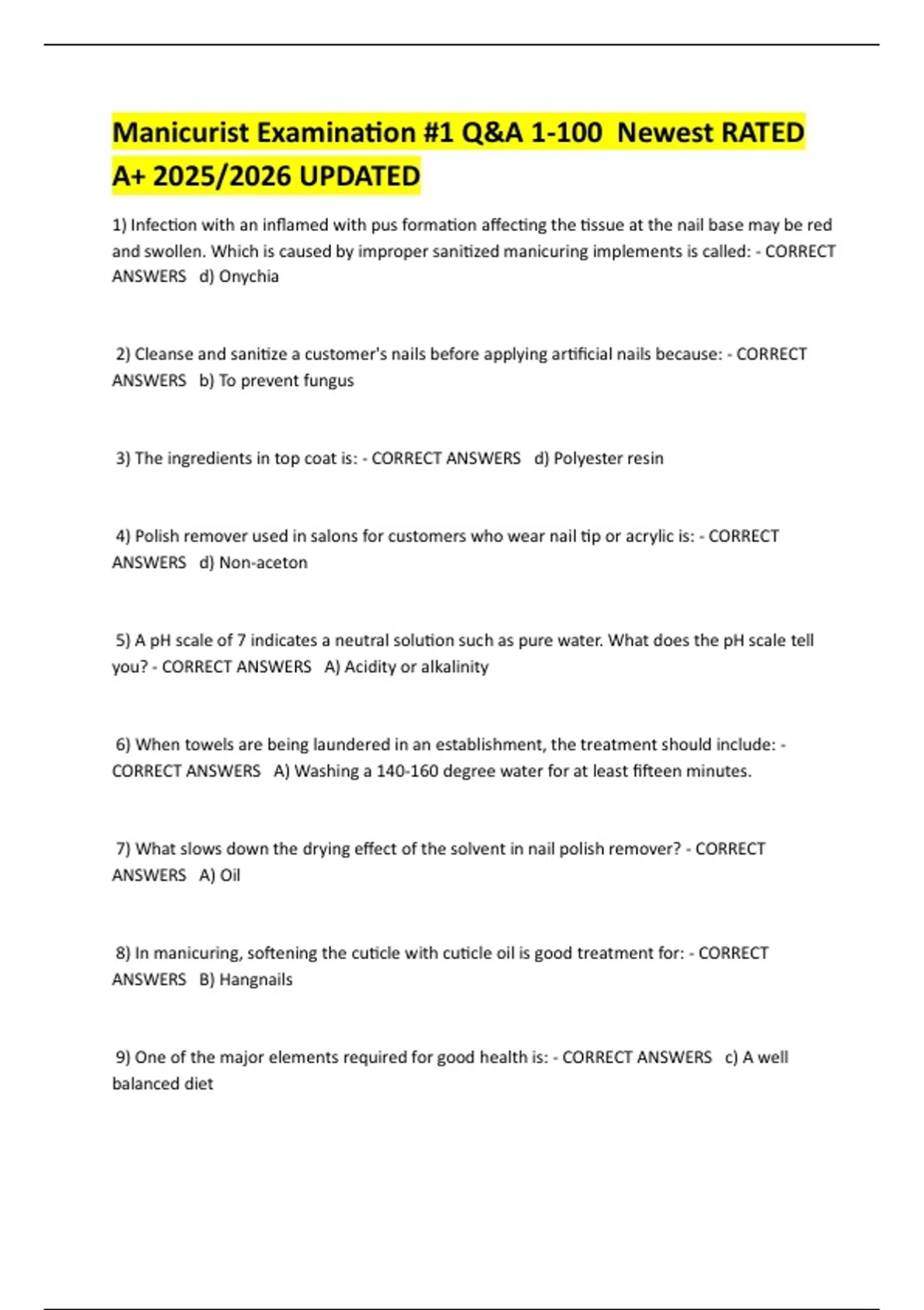 Manicurist Examination #1 Q&A 1-100 Newest RATED A+ 2025/2026 UPDATED