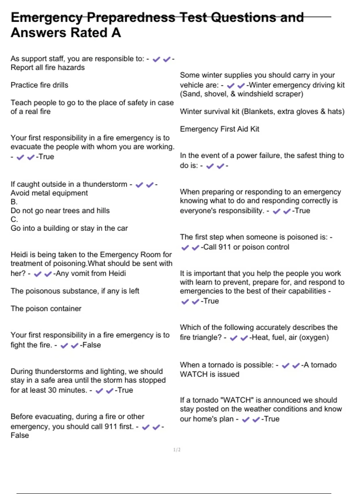 As support staff, you are responsible to: - - Report all fire hazards Practice fire drills Teach people to go to the place of safety in case of a real fire Your first responsibility in a fire emergency is to evacuate the people with whom you are working. - -True If caught outside in a thunderstorm - - Avoid metal equipment B. Do not go near trees and hills C. Go into a building or stay in the car Heidi is being taken to the Emergency Room for treatme