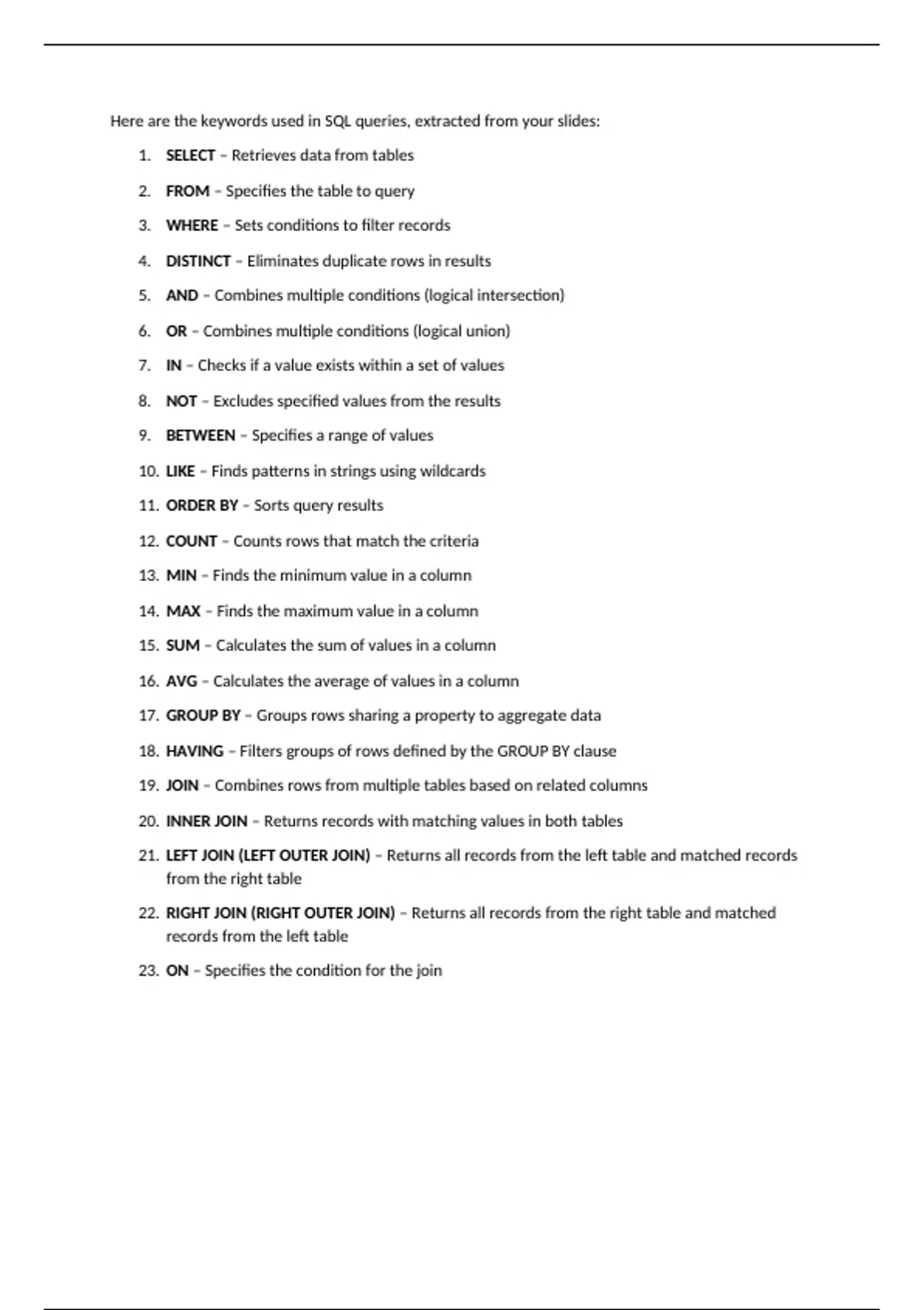 22. RIGHT JOIN (RIGHT OUTER JOIN) – Returns all records from the right table and matched