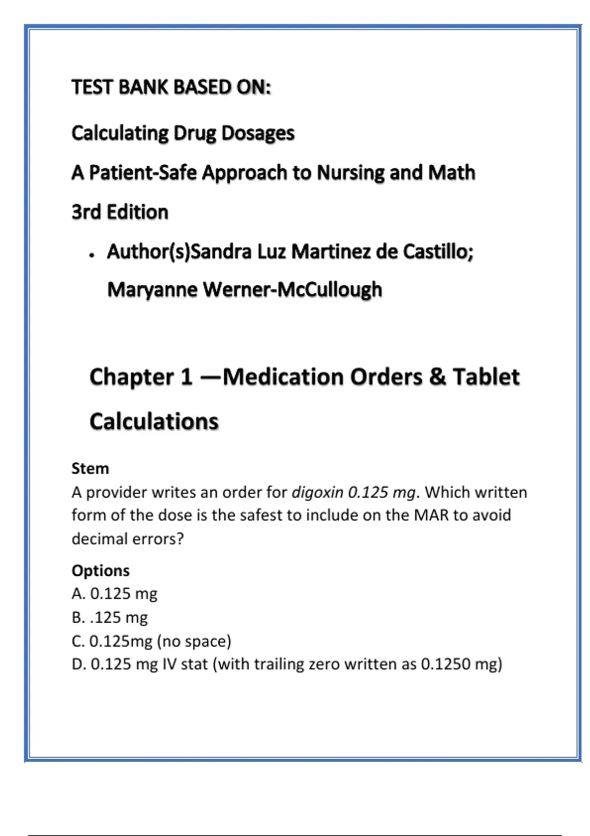 Test Bank for Calculating Drug Dosages 3rd Edition — Chapter-by-Chapter NCLEX Nursing Math, Step-by-Step Solutions & Verified Rationales Mastering medication math is essential for safe, accurate nursing practice. This chapter-by-chapter test bank is fully aligned with Calculating Drug Dosages: A Patient-Safe Approach to Nursing and Math, 3rd Edition by Martinez de Castillo & Werner-McCullough. Designed for undergraduate nursing students, NCLEX candidates, and faculty, it provides step-by-step calculations, dimensional analysis, and unit conversions with verified rationales for every correct answer. This resource strengthens exam readiness, prevents common calculation errors, and builds confidence in clinical safety. Each chapter offers a progressive set of questions that mirror textbook content, making it ideal for coursework, certification prep, or skills labs. Core Features: • Chapter-by-chapter organization covering all major dosage calculation topics • 20–40 original questions per chapter with detailed solutions • Step-by-step worked examples for dimensional analysis and conversions • Explanations of common errors to improve accuracy and safety • Printable quizzes and instructor answer key for flexible use This test bank is optimized to improve your accuracy, build clinical confidence, and prepare you for nursing exams. Download today and start practicing smarter. Hashtags: #NursingStudents #DosageCalculations #NCLEXPrep #NursingMath #MedicationSafety #PharmacologyReview #NursingSchoolHelp #ClinicalSkills #NursingEducation #TestBank calculating drug dosages test bank nursing math practice questions drug dosage calculations NCLEX dimensional analysis nursing patient-safe medication calculations dosage calculation chapter test bank nursing pharmacology practice quizzes clinical dosage calculation workbook