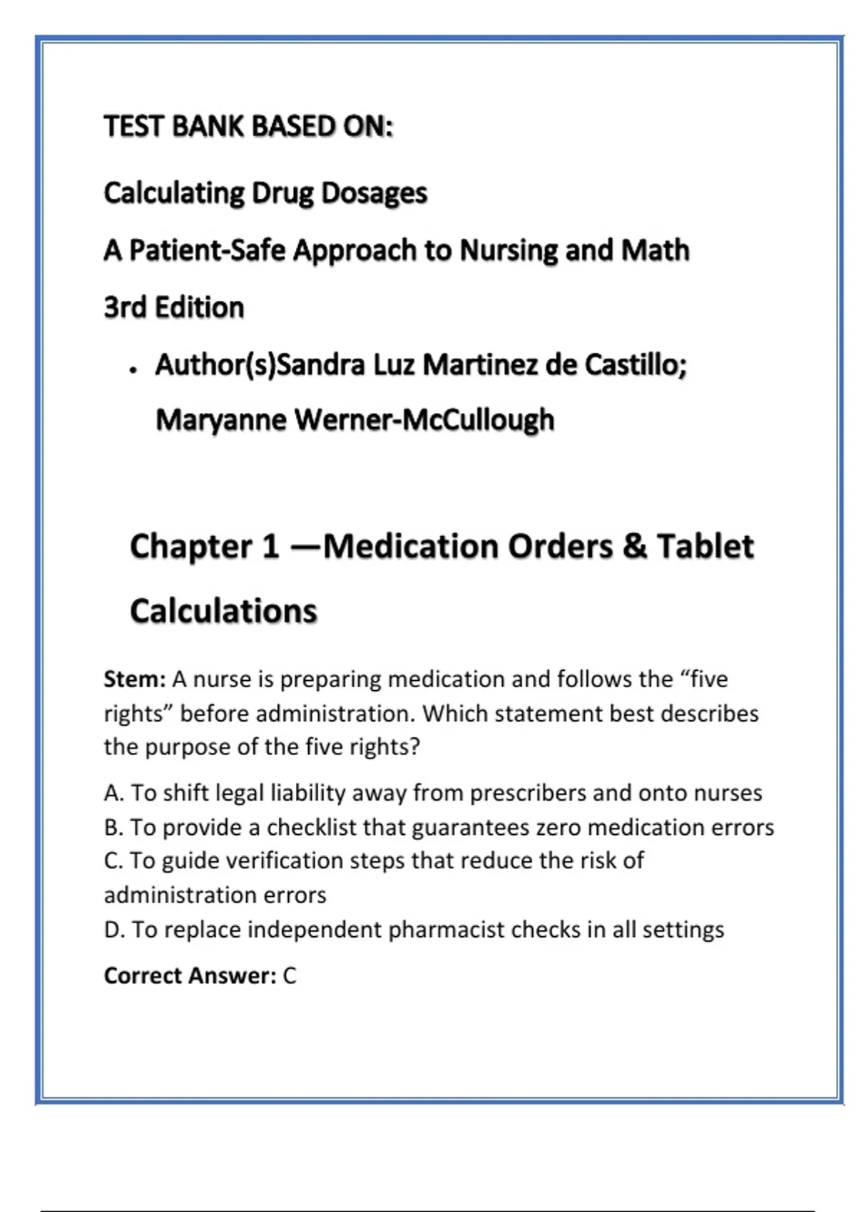 Calculating Drug Dosages Test Bank 3rd Edition | Chapter-by-Chapter NCLEX Nursing Math Practice, Step-by-Step Rationales Mastering medication math is essential for safe, accurate nursing practice. This chapter-by-chapter test bank is fully aligned with Calculating Drug Dosages: A Patient-Safe Approach to Nursing and Math, 3rd Edition by Martinez de Castillo & Werner-McCullough. Designed for undergraduate nursing students, NCLEX candidates, and faculty, it provides step-by-step calculations, dimensional analysis, and unit conversions with verified rationales for every correct answer. This resource strengthens exam readiness, prevents common calculation errors, and builds confidence in clinical safety. Each chapter offers a progressive set of questions that mirror textbook content, making it ideal for coursework, certification prep, or skills labs. Core Features: • Chapter-by-chapter organization covering all major dosage calculation topics • 20–40 original questions per chapter with detailed solutions • Step-by-step worked examples for dimensional analysis and conversions • Explanations of common errors to improve accuracy and safety • Printable quizzes and instructor answer key for flexible use This test bank is optimized to improve your accuracy, build clinical confidence, and prepare you for nursing exams. Download today and start practicing smarter. Hashtags: #NursingStudents #DosageCalculations #NCLEXPrep #NursingMath #MedicationSafety #PharmacologyReview #NursingSchoolHelp #ClinicalSkills #NursingEducation #TestBank calculating drug dosages test bank nursing math practice questions drug dosage calculations NCLEX dimensional analysis nursing patient-safe medication calculations dosage calculation chapter test bank nursing pharmacology practice quizzes clinical dosage calculation workbook