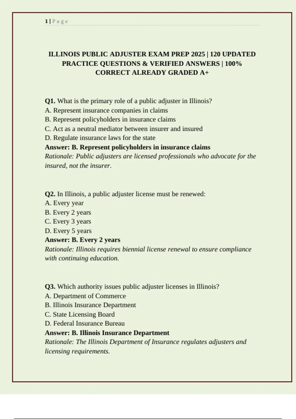 ILLINOIS PUBLIC ADJUSTER EXAM PREP 2025 | 120 UPDATED PRACTICE QUESTIONS & VERIFIED ANSWERS | 100% CORRECT ALREADY GRADED A+