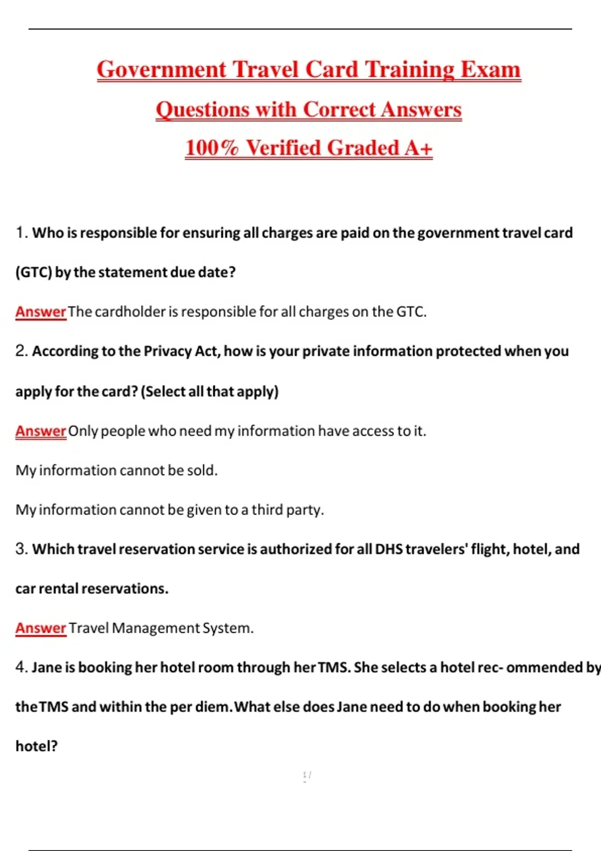 Government Travel Card Training Exam (Latest 2026/2027 Update) Complete Questions and Guide Answers, 100% Verified Graded A+ Prepare to pass the Government Travel Card Training Exam with this comprehensive 2025 study guide and practice test book. Designed for federal employees, managers, and personnel responsible for government travel card usage, this guide covers card policies, proper usage, compliance regulations, travel expense reporting, and best practices for managing federal travel accounts. Featuring realistic practice questions, detailed explanations, and test-taking strategies, this resource helps candidates gain confidence, understand key policies, and ensure compliance with federal travel card regulations. Perfect for self-study, employee training programs, or classroom prep, it is an essential tool for anyone seeking to successfully complete the Government Travel Card Training Exam. Includes practice questions with complete answers and explanations Covers federal travel card policies, compliance, and expense management Provides tips and strategies to improve exam performance Ideal for federal employees, managers, and government personnel Government Travel Card Training Exam, federal travel card certification prep, government travel card practice test, travel card exam study guide, federal employee travel card training, government travel card compliance test, travel expense reporting exam prep, government card exam questions and answers, federal travel card training study book, Amazon government travel card exam prep Prepare effectively for the Government Travel Card Training Exam with this comprehensive study guide and practice test. Covering card policies, proper usage, compliance regulations, travel expense reporting, and federal travel account management, this resource provides practice questions and detailed explanations to help federal employees and managers pass the exam with confidence. Government Travel Card Training Exam, federal travel card exam prep, government travel card study guide, travel card compliance test, federal employee travel card training, government travel card practice questions, travel expense reporting exam, federal travel card usage, government card exam study, travel card certification prep