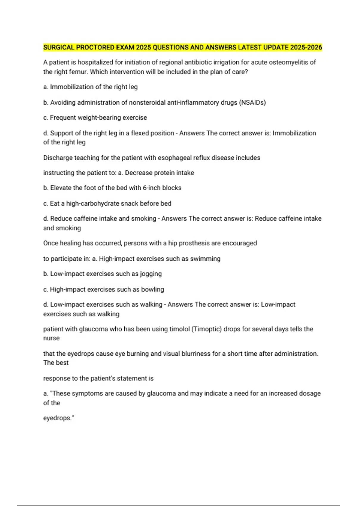SURGICAL PROCTORED EXAM 2025 QUESTIONS AND ANSWERS LATEST UPDATE A patient is hospitalized for initiation of regional antibiotic irrigation for acute osteomyelitis of the right femur. Which intervention will be included in the plan of care? a. Immobilization of the right leg b. Avoiding administration of nonsteroidal anti-inflammatory drugs (NSAIDs) c. Frequent weight-bearing exercise d. Support of the right leg in a flexed position - Answers The correct answer is: Immobilization of the right leg Discharge teaching for the patient with esophageal reflux disease includes instructing the patient to: a. Decrease protein intake b. Elevate the foot of the bed with 6-inch blocks c. Eat a high-carbohydrate snack before bed d. Reduce caffeine intake and smoking - Answers The correct answer is: Reduce caffeine intake and smoking Once healing has occurred, persons with a hip prosthesis are encouraged to participate in: a. High-impact exercises such as swimming b. Low-impact exercises such as jogging c. High-impact exercises such as bowling d. Low-impact exercises such as walking - Answers The correct answer is: Low-impact exercises such as walking patient with glaucoma who has been using timolol (Timoptic) drops for several days tells the nurse that the eyedrops cause eye burning and visual blurriness for a short time after administration. The best response to the patient's statement is a. "These symptoms are caused by glaucoma and may indicate a need for an increased dosage of the eyedrops." b. "The drops are uncomfortable, but it is very important for you to use them as prescribed to retain your vision." c. "These are normal side effects of the drug, which should become less noticeable with time." d. "If you occlude the puncta after you administer the drops, it will help relieve these side effects." - Answers The correct answer is: "The drops are uncomfortable, but it is very important for you to use them as prescribed to retain your vision." Patients should be taught that Zollinger-Ellison syndrome is: a. An ulcerative syndrome caused by a gastrinoma b. An infectious syndrome caused by Helicobacter pylori c. Related to the indiscriminate use of nonsteroidal antiinflammatory drugs (NSAIDs) d. A type of peptic ulcer related to stress - Answers The correct answer is: An ulcerative syndrome caused by a gastrinoma After a patient has a short-arm plaster cast applied in the emergency department, which statement by the patient indicates a good understanding of the nurse's discharge teaching? a. "I can use a cotton-tipped applicator to rub lotion on any dry areas under the cast." b. "I should avoid moving my fingers and elbow until the cast is removed." c. "I can get the cast wet as long as I dry it right away with a hair dryer." d. "I will apply an ice pack to the cast over the fracture site for the next 24 hours." - Answers The correct answer is: "I will apply an ice pack to the cast over the fracture site for the next 24 hours." The leading cause of blindness in the elderly is: a. Glaucoma b. Macular degeneration c. Ocular tumors d. Retinal detachment - Answers The correct answer is: Macular degeneration Which describes a fracture located at a 45-degree angle to the long axis of bone? a. Oblique fracture b. Impacted fracture c. Avulsion fracture d. Compound fracture - Answers The correct answer is: Oblique fracture Dumping syndrome after gastric surgery: a. Can be controlled by increasing fluid ingestion
