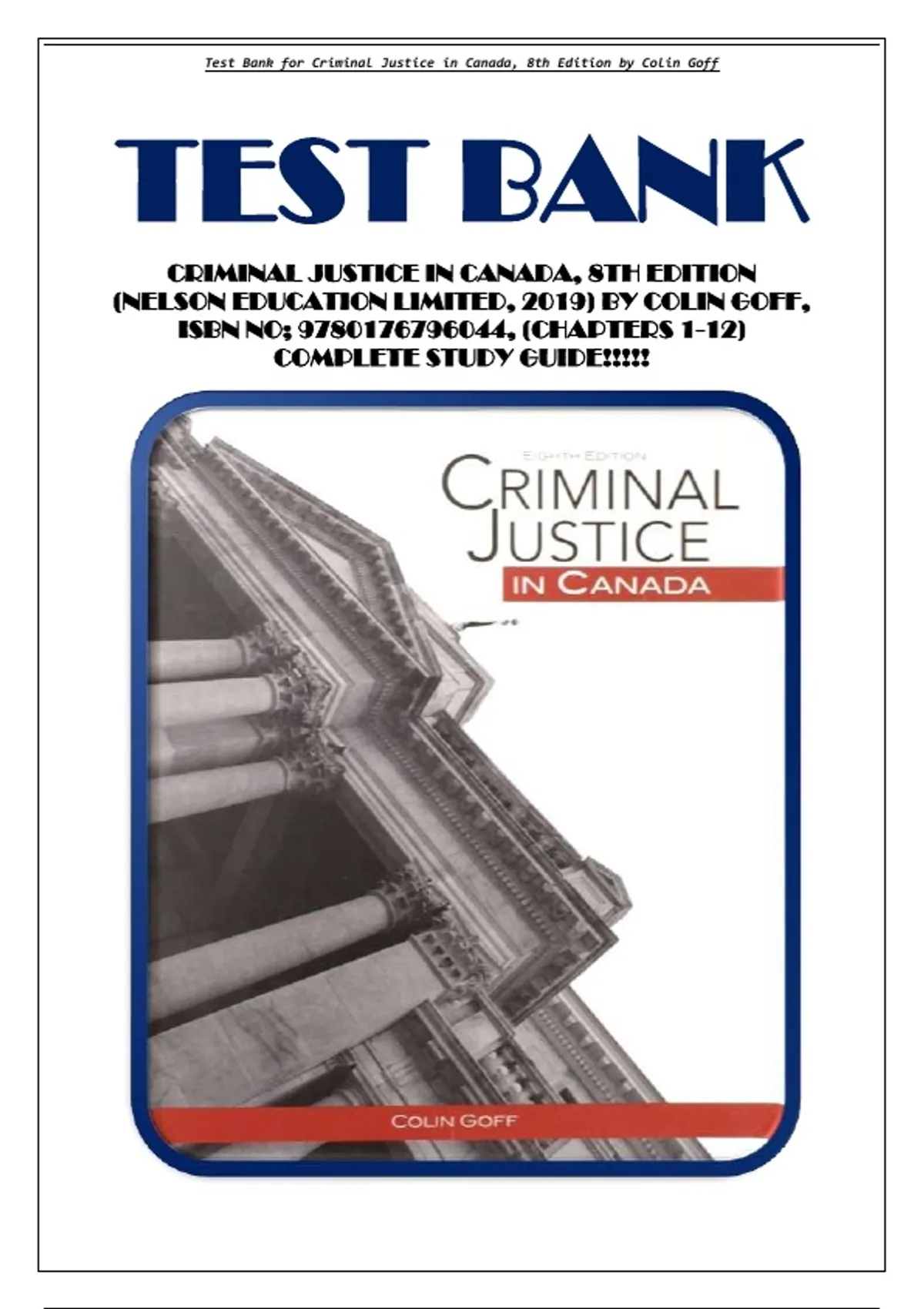 Test Bank for Criminal Justice in Canada, 8th Edition (Nelson Education Limited, 2019) by Colin Goff, Isbn no; 9780176796044, (Chapters 1-12) Complete Study Guide!!!!!