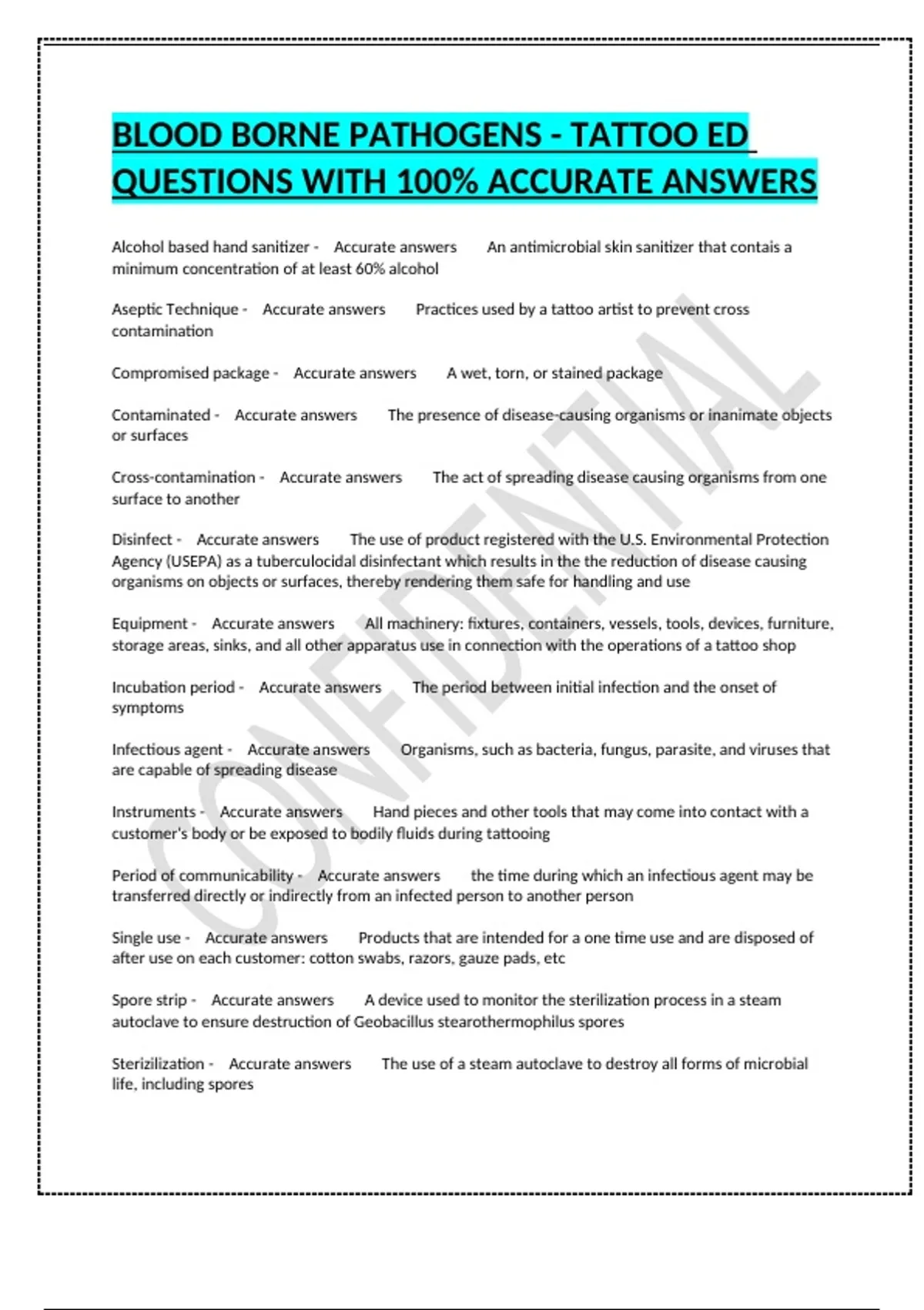 BLOOD BORNE PATHOGENS - TATTOO ED QUESTIONS WITH 100% ACCURATE ANSWERS