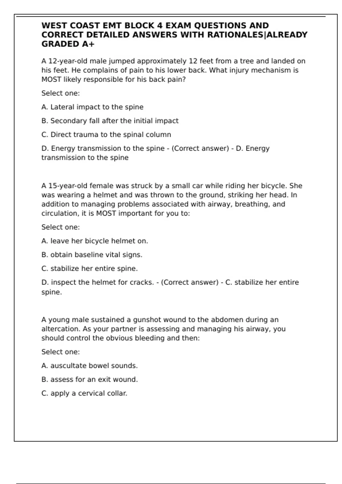 WEST COAST EMT BLOCK 4 EXAM QUESTIONS AND CORRECT DETAILED ANSWERS WITH RATIONALES|ALREADY GRADED A+