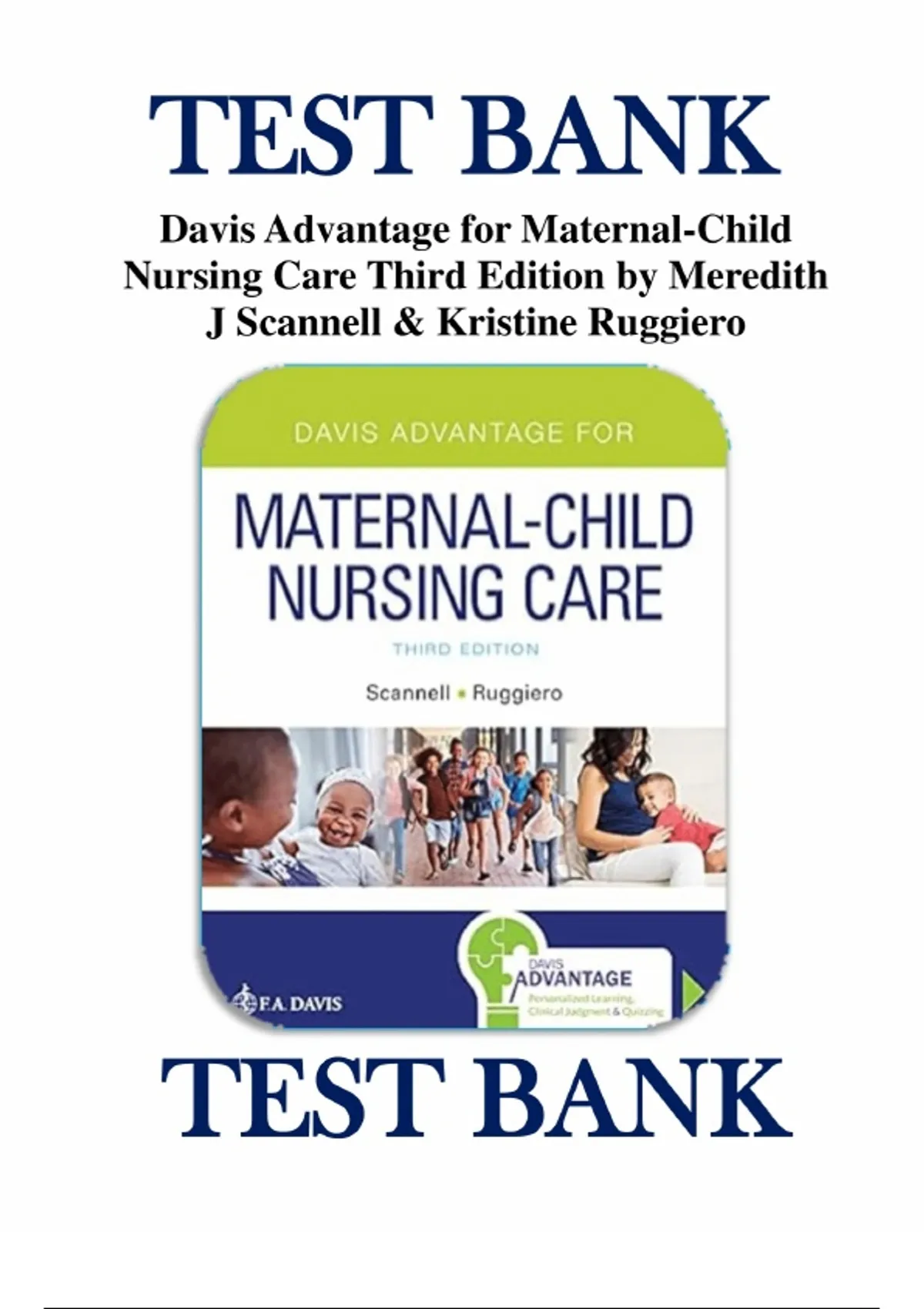 Test Bank for Davis Advantage for Maternal-Child Nursing Care 3rd Edition by Scannell Ruggiero Test Bank with Question and Answers, Chapter 1-27 |Complete Test bank Guide A+ | ISBN: 978-5 Table of Contents 1.Core Concepts of Maternal and Pediatric Healthcare Across the Continuum 2.Reproduction 3.Conception and Development of the Embryo and Fetus 4.Physiological and Psychosocial Changes During Pregnancy 5.Promoting a Healthy Pregnancy 6.Caring for the Woman Experiencing Complications During Pregnancy 7.The Process of Labor and Birth 8.Caring for the Woman Experiencing Complications During Labor and Birth 9.Physiological Transition of the Newborn 10.Caring for the Newborn at Risk 11.Caring for the Postpartal Woman and Her Family 12.Caring for the Woman Experiencing Complications During the Postpartal Period 13.Caring for the Developing Child 14.Developmentally Appropriate Nursing Care Across Care Settings 15.Caring for the Child With a Respiratory Condition 16.Caring for the Child With a Gastrointestinal Condition 17.Caring for the Child With a Cardiovascular Condition 18.Caring for the Child With an Immunological or Infectious Condition 19.Caring for the Child With an Endocrinological or Metabolic Condition 20.Caring for the Child With a Neurological or Sensory Condition 21.Caring for the Child With a Musculoskeletal Condition 22.Caring for the Child With an Integumentary Condition 23.Caring for the Child With a Genitourinary Condition 24.Caring for the Child With a Hematological Condition 25.Caring for the Child With a Cognitive or Psychosocial Impairment 26.Caring for the Child With Cancer 27.Caring for the Child with a Chronic Condition, Disability, or End-of-Life Care