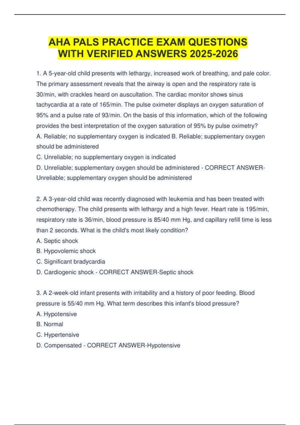 1. A 5-year-old child presents with lethargy, increased work of breathing, and pale color.