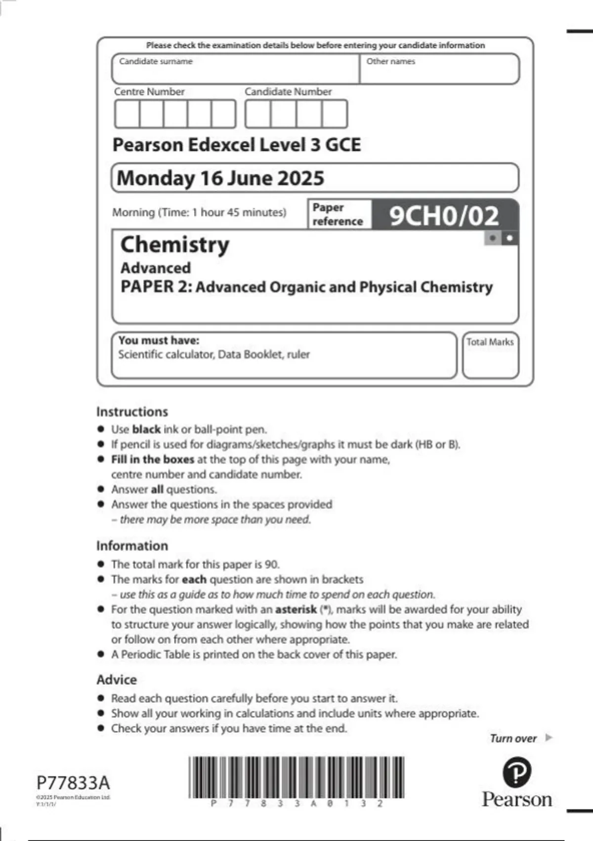 Pearson Edexcel level 3 GCE 9CHO/02 Chemistry Advanced PAPER 2:Advanced Organic and Physical Chemistry question paper June 2025