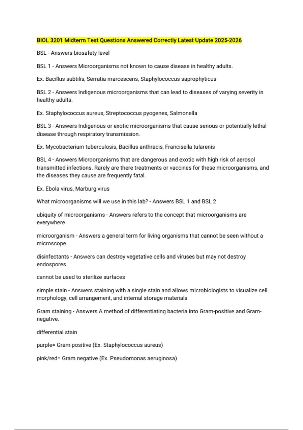 BIOL 3201 Midterm Test Questions Answered Correctly Latest Update BSL - Answers biosafety level BSL 1 - Answers Microorganisms not known to cause disease in healthy adults. Ex. Bacillus subtilis, Serratia marcescens, Staphylococcus saprophyticus BSL 2 - Answers Indigenous microorganisms that can lead to diseases of varying severity in healthy adults. Ex. Staphylococcus aureus, Streptococcus pyogenes, Salmonella BSL 3 - Answers Indigenous or exotic microorganisms that cause serious or potentially lethal disease through respiratory transmission. Ex. Mycobacterium tuberculosis, Bacillus anthracis, Francisella tularenis BSL 4 - Answers Microorganisms that are dangerous and exotic with high risk of aerosol transmitted infections. Rarely are there treatments or vaccines for these microorganisms, and the diseases they cause are frequently fatal. Ex. Ebola virus, Marburg virus What microorganisms will we use in this lab? - Answers BSL 1 and BSL 2 ubiquity of microorganisms - Answers refers to the concept that microorganisms are everywhere microorganism - Answers a general term for living organisms that cannot be seen without a microscope disinfectants - Answers can destroy vegetative cells and viruses but may not destroy endospores cannot be used to sterilize surfaces simple stain - Answers staining with a single stain and allows microbiologists to visualize cell morphology, cell arrangement, and internal storage materials Gram staining - Answers A method of differentiating bacteria into Gram-positive and Gram-negative. differential stain purple= Gram positive (Ex. Staphylococcus aureus) pink/red= Gram negative (Ex. Pseudomonas aeruginosa) crystal violet - Answers primary stain Gram's iodine - Answers mordant ethanol - Answers decolorizer safranin - Answers counterstain cocci - Answers bacteria with a spherical morphology Ex. Streptococcus in chains, Staphylococcus in clusters rods (bacilli) - Answers bacteria with a rod shaped morphology Ex. Pseudomonas aeruginosa singly, Bacillus in chains spiral/ curved - Answers corkscrew rods Ex. Campylobacter aerobic bacteria - Answers Bacteria that require oxygen for growth hydrogen peroxide - Answers produced as a by-product aerobic respiration highly reactive oxidizing agent catalase - Answers enzyme produced by aerobes that degrades hydrogen peroxide to oxygen and water strict anaerobes - Answers cannot grow in the presence of oxygen lack catalase aerotolerant bacteria - Answers anaerobes that tolerate oxygen lack catalase facultative anaerobes - Answers bacteria that can grow by respiration or fermentation/ with or without oxygen produce catalase catalase test - Answers differentiates microorganisms based on their ability to produce the catalase enzyme bubbles= catalase positive (Ex. Escherichia coli) no bubbles= catalase negative (Ex. Enterococcus faecalis) oxidase test - Answers assays for the presence of cytochrome oxidase, an enzyme in the electron transport chain blue= oxidase positive (Ex. Pseudomonas aeruginosa) no color change= oxidase negative (Ex. Staphylococcus aureus)