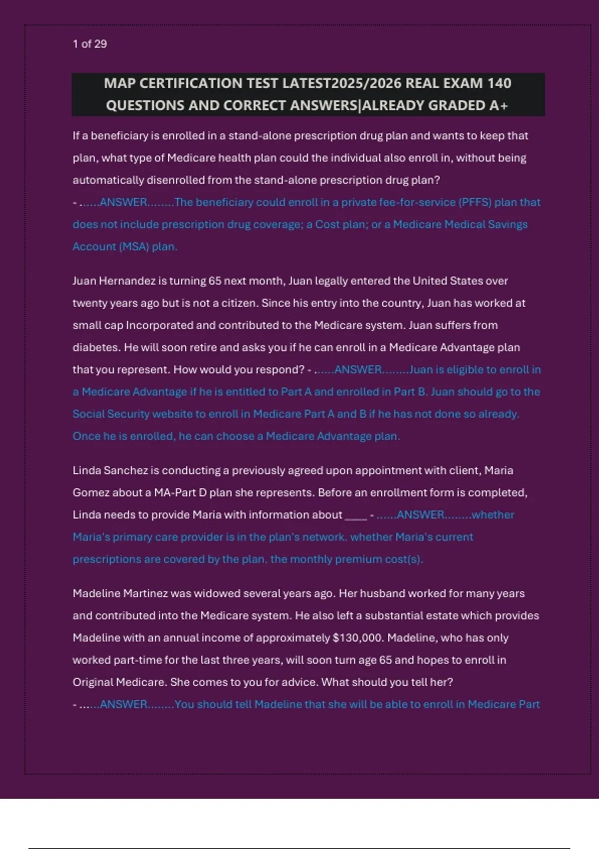 Prepare for your MAP (Medicare Advantage and Part D) certification exam with this comprehensive 2025/2026 study guide. This resource features 140 real exam-style questions and correct answers, covering all key topics including Medicare Advantage (MA) plans, Part D prescription drug coverage, eligibility rules, enrollment periods (AEP, ICEP, SEP), marketing guidelines, and compliance. Ideal for insurance agents and brokers seeking to pass their certification test on the first try. Master complex scenarios involving Special Needs Plans (SNPs), PFFS plans, HMOs, PPOs, and client counseling to ensure you are fully prepared for the actual exam.