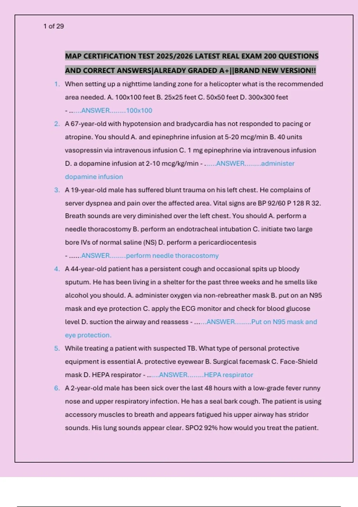 Prepare for the MAP Certification Test with this comprehensive collection of 200 latest real exam questions and correct answers for 2025/2026. This resource covers a wide range of emergency medical scenarios, including trauma management, cardiac care, pediatric emergencies, airway procedures, pharmacology, and situational judgment. Each question is paired with a verified answer to help you review key concepts, test your knowledge, and build confidence for exam day. Ideal for paramedics, EMTs, and advanced medical professionals seeking certification or recertification.