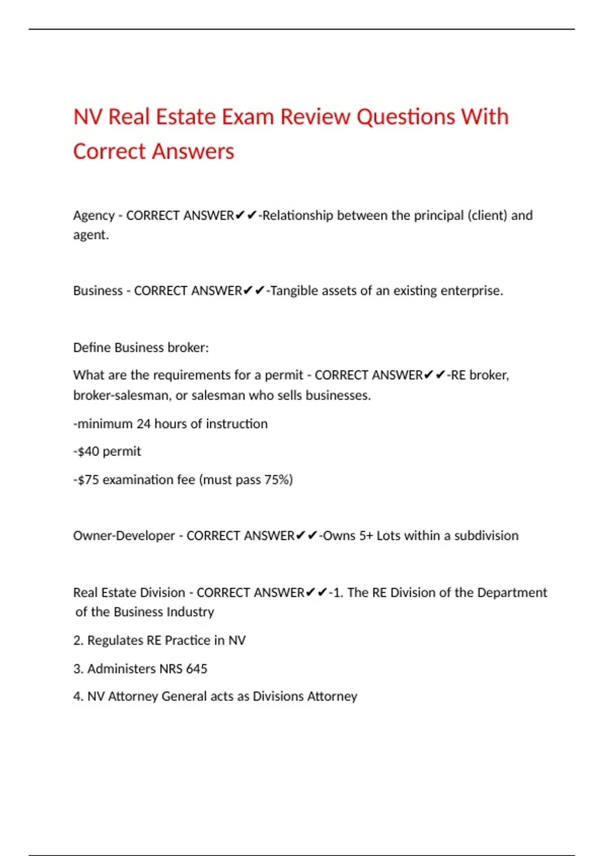 NV Real Estate Exam Review Questions With Correct Answers