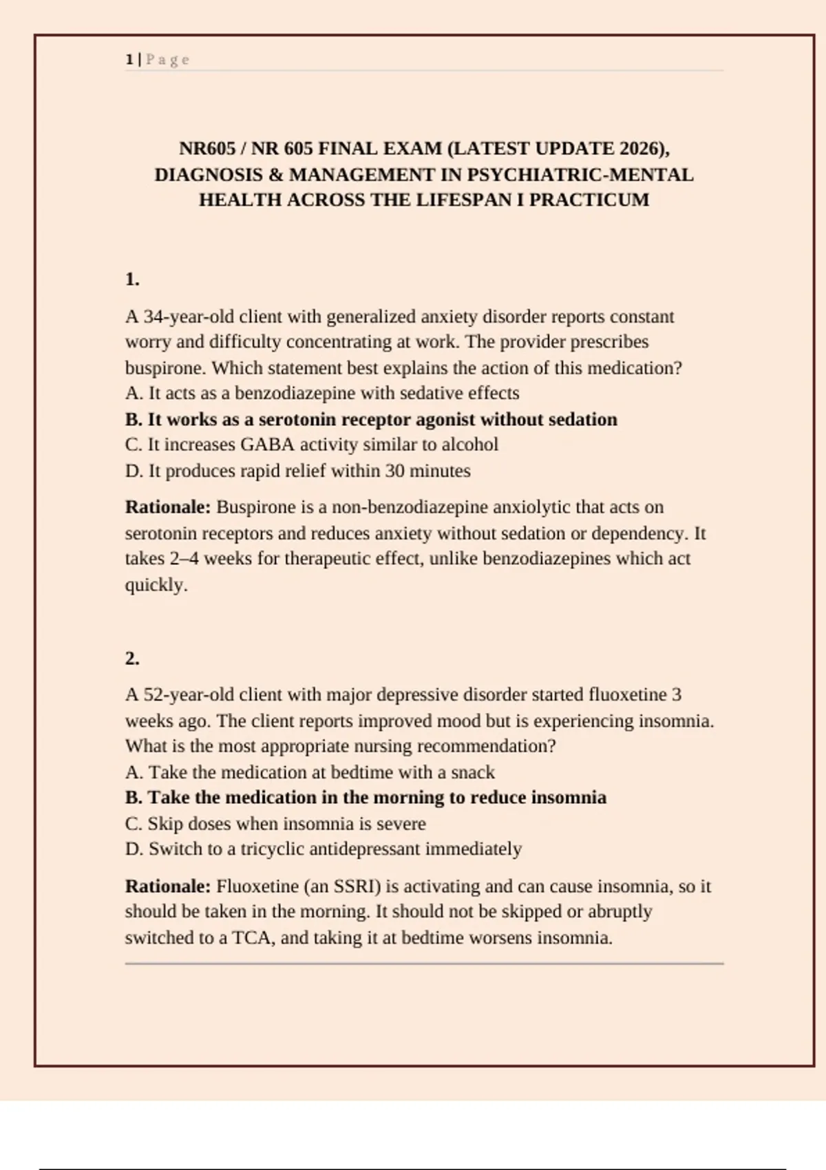 This NR605 / NR 605 Final Exam (Latest 2024 / 2025) study guide for Diagnosis & Management in Psychiatric-Mental Health Across the Lifespan I Practicum includes 120 practice questions with detailed rationales and correct answers. Content covers psychiatric disorders, therapeutic communication, psychopharmacology, mood disorders, schizophrenia, anxiety, PTSD, substance use, personality disorders, and lifespan mental health care. Each NCLEX-style question has answer choices, the correct option in bold, and full rationales for deep learning. Ideal for nurse practitioner students preparing for NR605 exams, clinical practicums, and board readiness, this updated test bank boosts confidence, knowledge, and exam performance.
