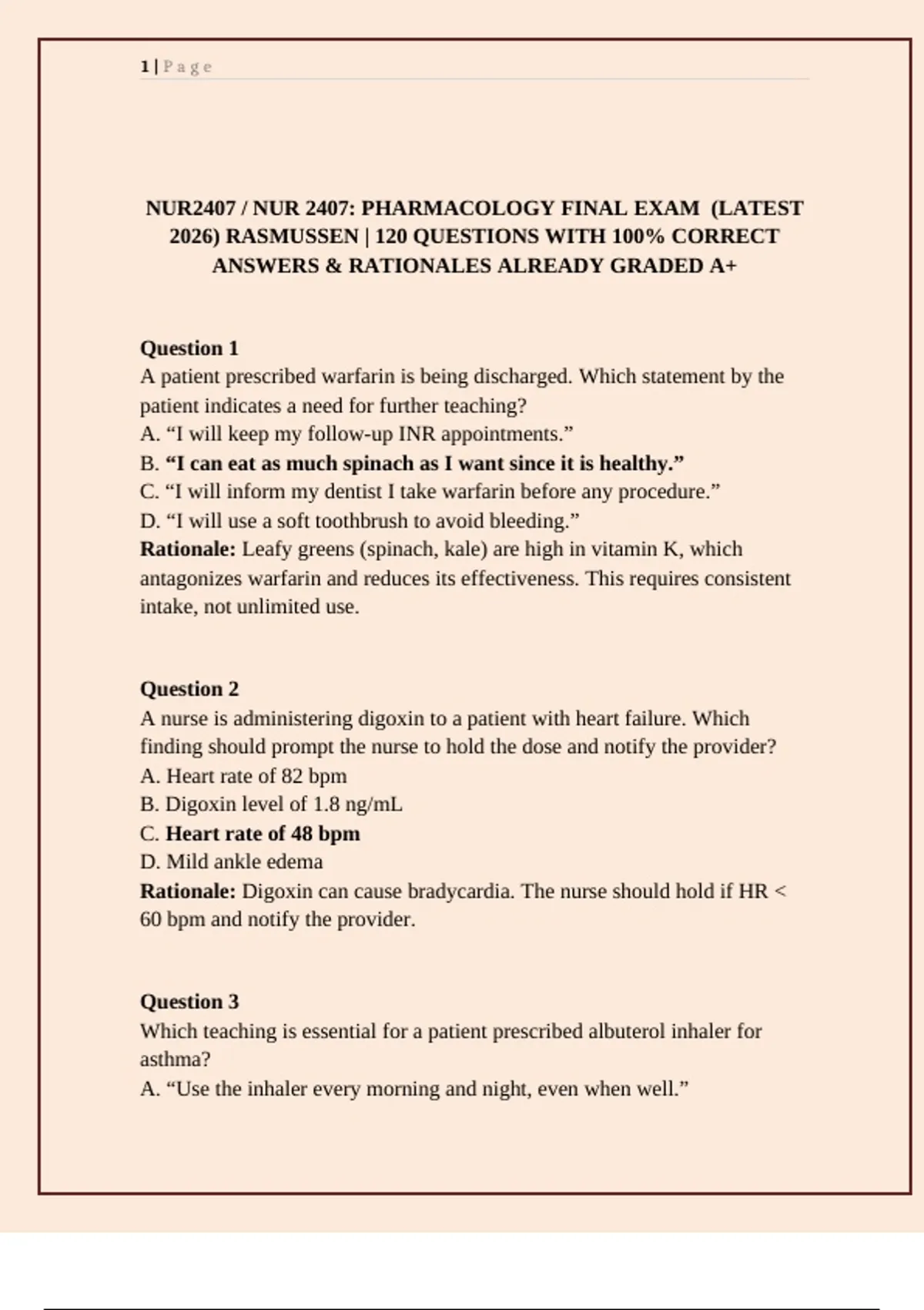 NUR2407 / NUR 2407: PHARMACOLOGY FINAL EXAM (LATEST 2026) RASMUSSEN | 120 QUESTIONS WITH 100% CORRECT ANSWERS & RATIONALES ALREADY GRADED A+