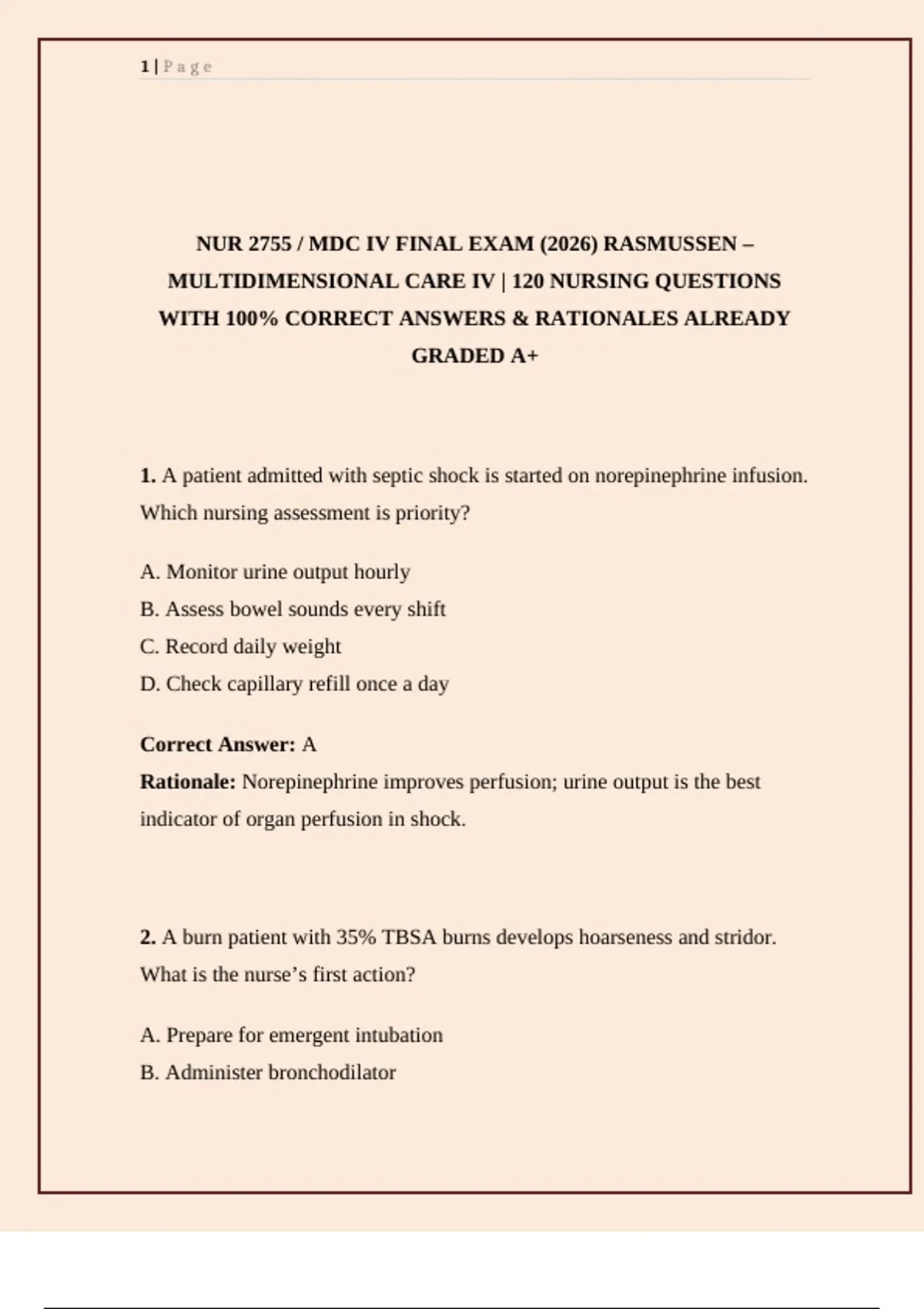 Get ready for NUR 2755 / MDC IV Exam 1 at Rasmussen University with this updated 2026 nursing exam prep guide. Featuring 120 verified practice questions with multiple-choice options, correct answers, and detailed rationales, this resource covers Multidimensional Care IV (MDC 4) topics including burns, trauma, shock, ARDS, sepsis, neurological and cardiac emergencies, and critical care nursing interventions. Designed for Rasmussen nursing students, this comprehensive study tool strengthens knowledge, enhances test-taking strategies, and boosts exam readiness. Perfect alternative to costly test banks, it provides reliable, up-to-date content for achieving success on the NUR 2755 Exam 1.”