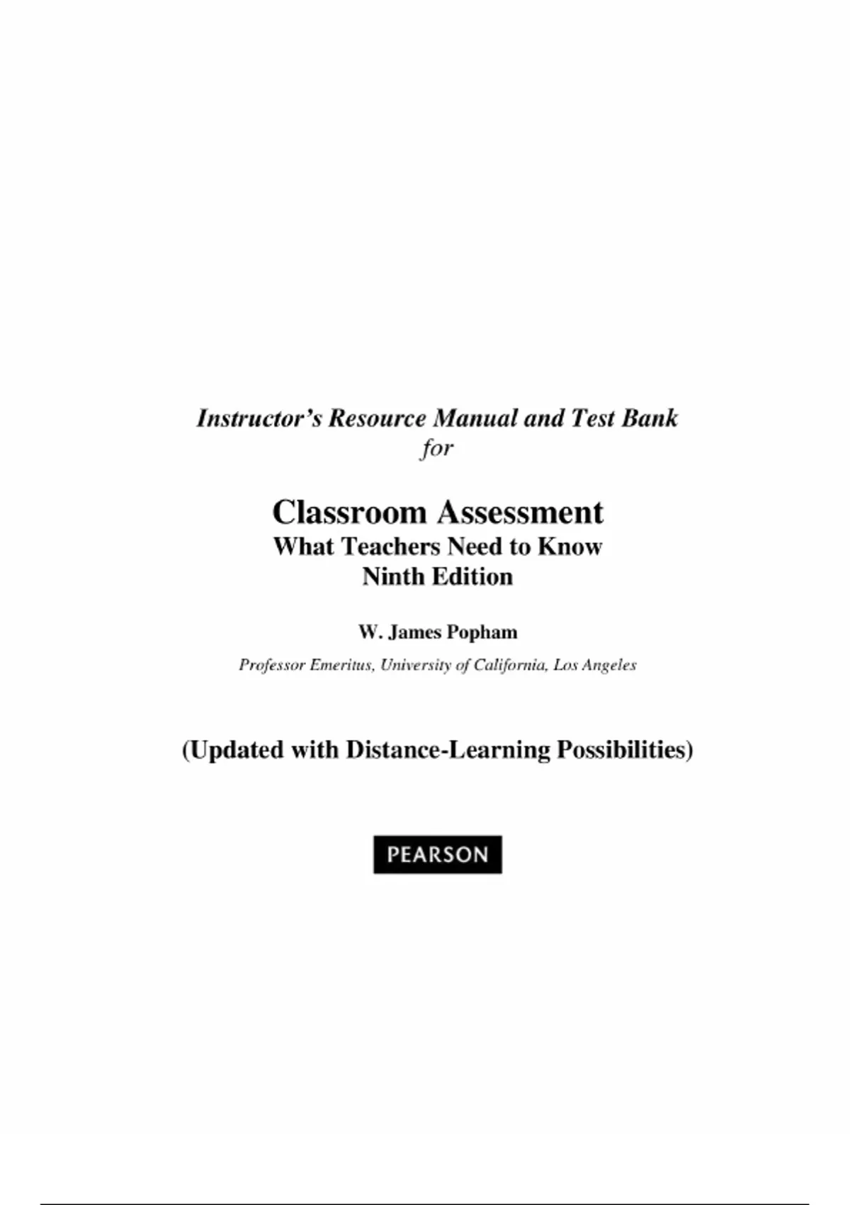 The Instructor’s Resource Manual & Test Bank for Classroom Assessment: What Teachers Need to Know, 9th Edition by W. James Popham (ISBN 978-0135569108) offers a complete set of teaching aids and assessment items to support instructors in assessment courses. Verified online sources include a complete IRM listing covering Chapters 1–16. This manual includes: annotated answer keys, test question banks (multiple-choice, true/false, short answer, and applied items), chapter alignment of items, sample quizzes, midterm and final examinations, and guidance on distance-learning adaptation. It covers the full chapter sequence: Chapter 1: Why Do Teachers Need to Know About Assessment?, Chapter 2: Deciding What to Assess, Chapter 3: Reliability of Assessment, Chapter 4: Validity, Chapter 5: Fairness, Chapter 6: Selected-Response Tests, Chapter 7: Constructed-Response Tests, Chapter 8: Performance Assessment, Chapter 9: Portfolio Assessment, Chapter 10: Affective Assessment, Chapter 11: Improving Teacher-Developed Assessments, Chapter 12: Formative Assessment, Chapter 13: Making Sense Out of Standardized Test Scores, Chapter 14: Appropriate and Inappropriate Test-Preparation Practices, Chapter 15: The Evaluation of Instruction, and Chapter 16: Assessment-Based Grading.