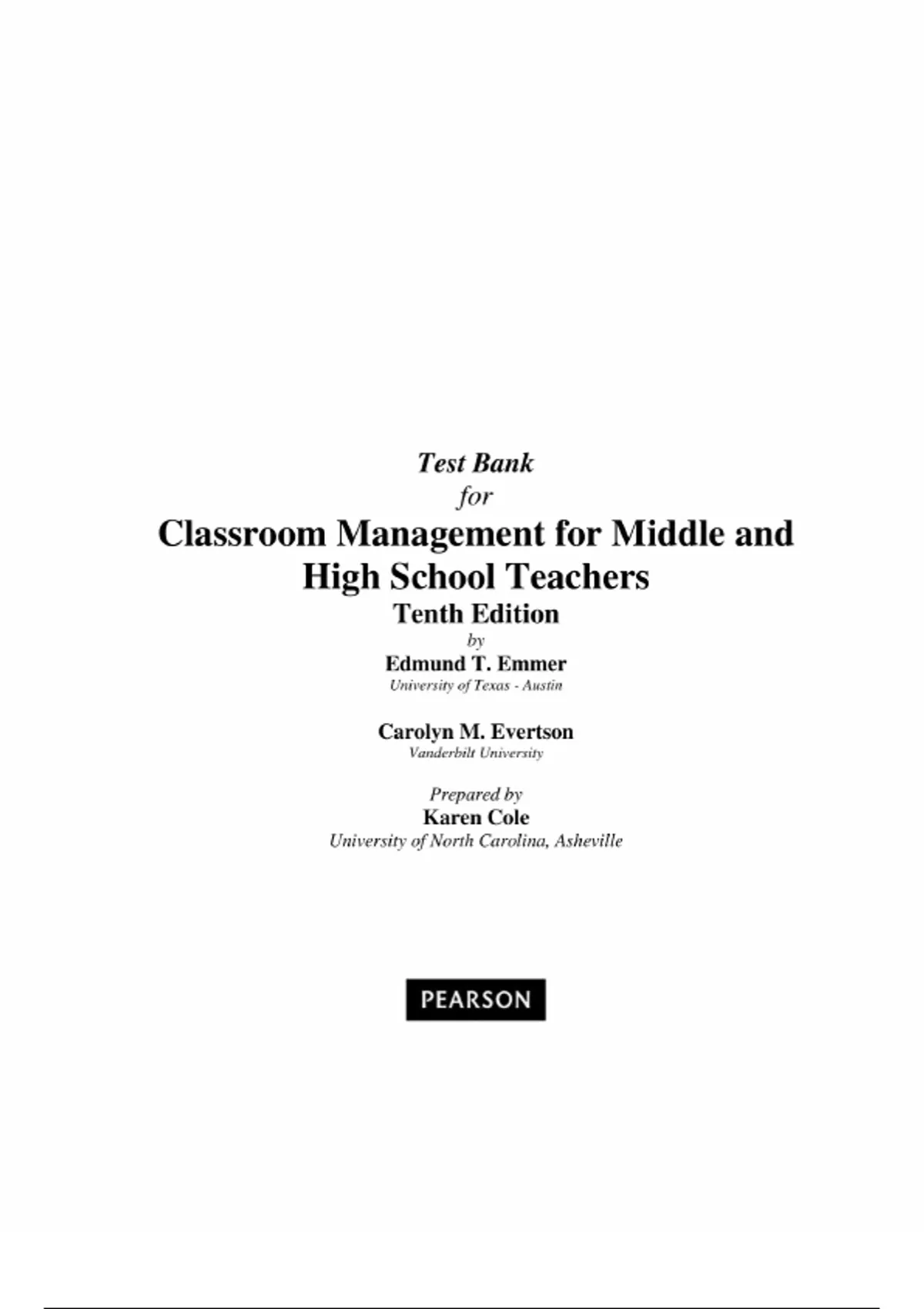 The Test Bank for Classroom Management for Middle and High School Teachers, 10th Edition by Edmund T. Emmer & Carolyn M. Evertson (ISBN 978-0134028811) provides a full set of instructor-ready assessment items—multiple-choice, true/false, short answer, and scenario-based problems—that align closely with the text’s official chapters and pedagogical aims. Verified listings show the 10th edition includes 12 core chapters. All chapters are covered in sequence: Chapter 1: Introduction to Classroom Management, Chapter 2: Building Supportive and Healthy Classroom Relationships, Chapter 3: Organizing Your Classroom and Materials, Chapter 4: Classroom Rules and Procedures, Chapter 5: Managing Student Work, Chapter 6: Getting Off to a Good Start, Chapter 7: Planning and Conducting Instruction, Chapter 8: Managing Cooperative Learning Groups, Chapter 9: Maintaining Appropriate Student Behavior, Chapter 10: Communication Skills for Teaching, Chapter 11: Managing Problem Behaviors, and Chapter 12: Managing Special Groups.