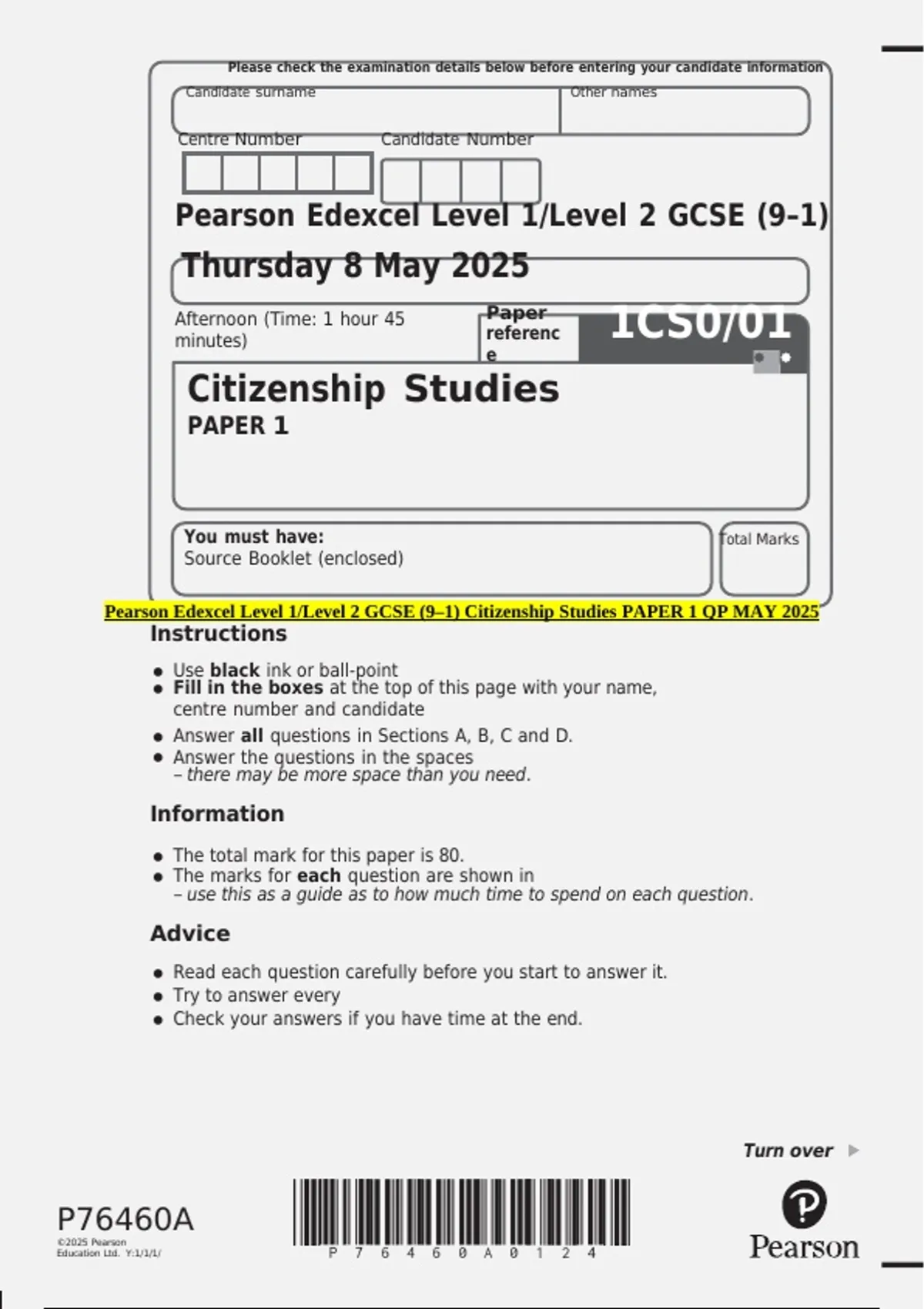 Pearson Edexcel Level 1/Level 2 GCSE (9–1) Citizenship Studies PAPER 1 QP MAY 2025