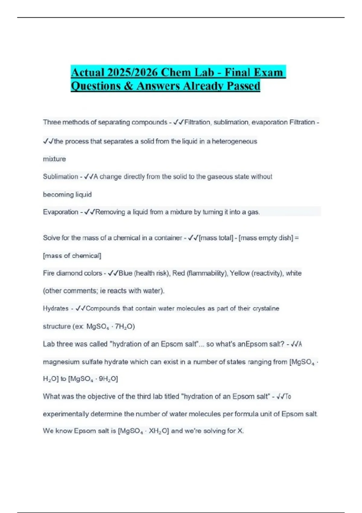 Actual 2025/2026 Chem Lab - Final Exam Questions & Answers Already Passed Three methods of separating compounds - ️️Filtration, sublimation, evaporation Filtration - ️️the process that separates a solid from the liquid in a heterogeneous mixture Sublimation - ️️A change directly from the solid to the gaseous state without becoming liquid Evaporation - ️️Removing a liquid from a mixture by turning it into a gas. Solve for the mass of a chemical in a container - ️️[mass total] - [mass empty dish] = [mass of chemical]